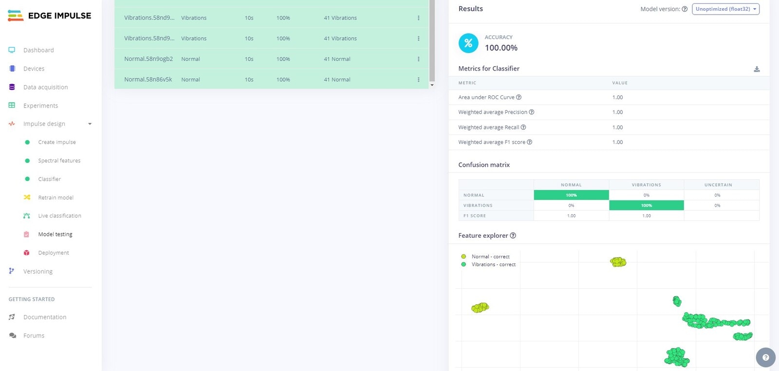 Edge Impulse Project Spectral Analysis Classification Testing