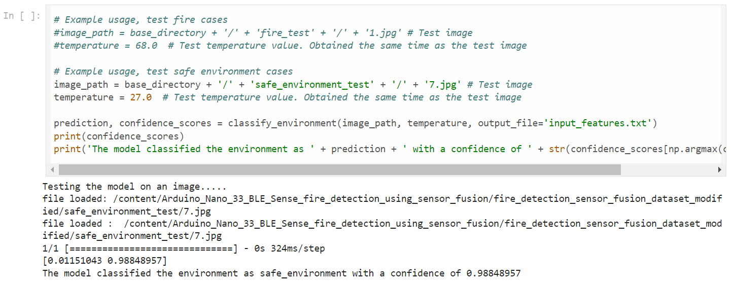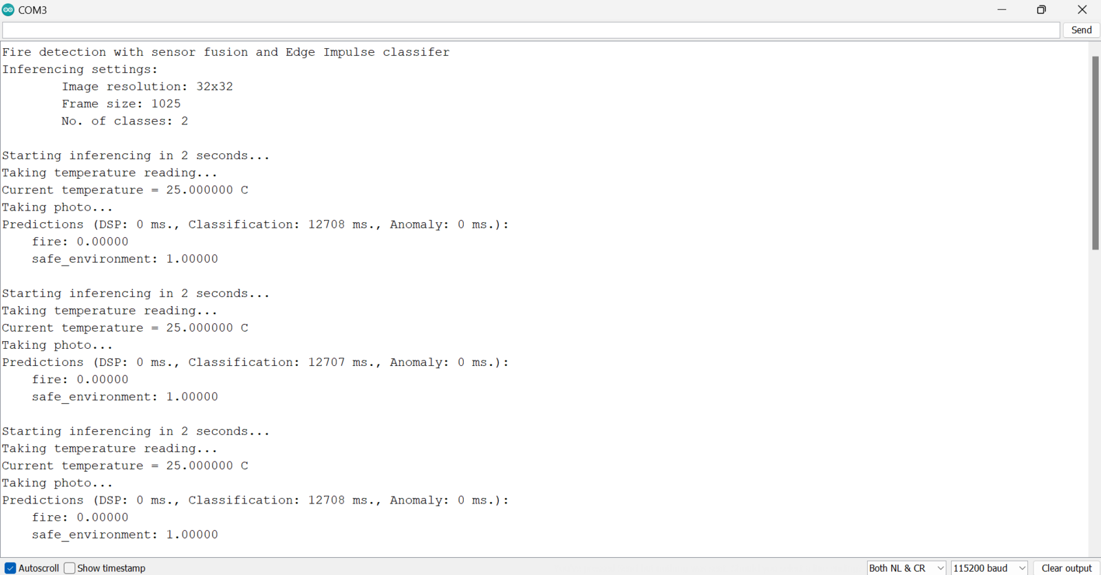 After the Arduino library has finished downloading, we can open the Arduino IDE and install the zipped library. Afterwards we open the inference Sketch in the Arduino IDE. Feel free to clone the GitHub repository or copy and paste the code to an Arduino Sketch on your computer. In the inference Sketch, we need to ensure that the variablesEI_CAMERA_RAW_FRAME_BUFFER_COLS, EI_CAMERA_RAW_FRAME_BUFFER_ROWS, WIDTH, and HEIGHT have the same image dimensions as the one used in the model training. Finally, we can upload the inference Sketch on the Arduino Nano 33 BLE Sense. Once the code is uploaded, the Arduino board will record the room temperature, capture an image, and then classify if the environment is safe or has a fire. The inference Sketch follows a similar operation as the data collection code. The main difference in this case is that the data are not printed to Serial. In fact, the inference Sketch is also built from the nano_33ble_sense_camera.ino example code. I updated the code to also get temperature value and then in the function ei_camera_cutout_get_data, we can append the temperature value to the buffer that will afterwards be passed to the classifier which in this case is our multi-input model.