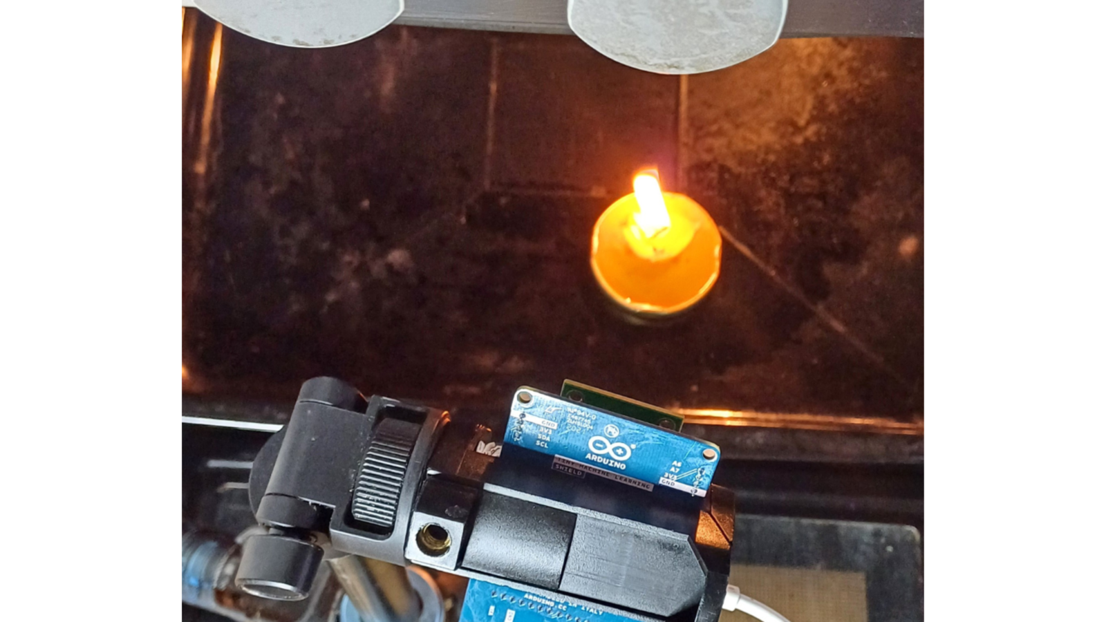 Since fire is dangerous and difficult to control, I used an oven and a candle to collect data. The oven generates temperatures higher than the ambient room temperatures and this can be detected by a temperature sensor. The candles gives a flame which can be optically detected by a camera. Therefore, both sensors compliment each other. I secured the Arduino TinyML kit on a tripod stand and faced it to an oven. For the safe environment (safe_environment class), I had the oven switched off and the candle was not lit. In total, I collected 60 images and 60 temperature values that were ranging between 23 and 27 degrees Celsius. The images below show photos of how the Arduino board was placed next to an oven, an image that was captured and also the .CSV file with the temperature values and the class label.