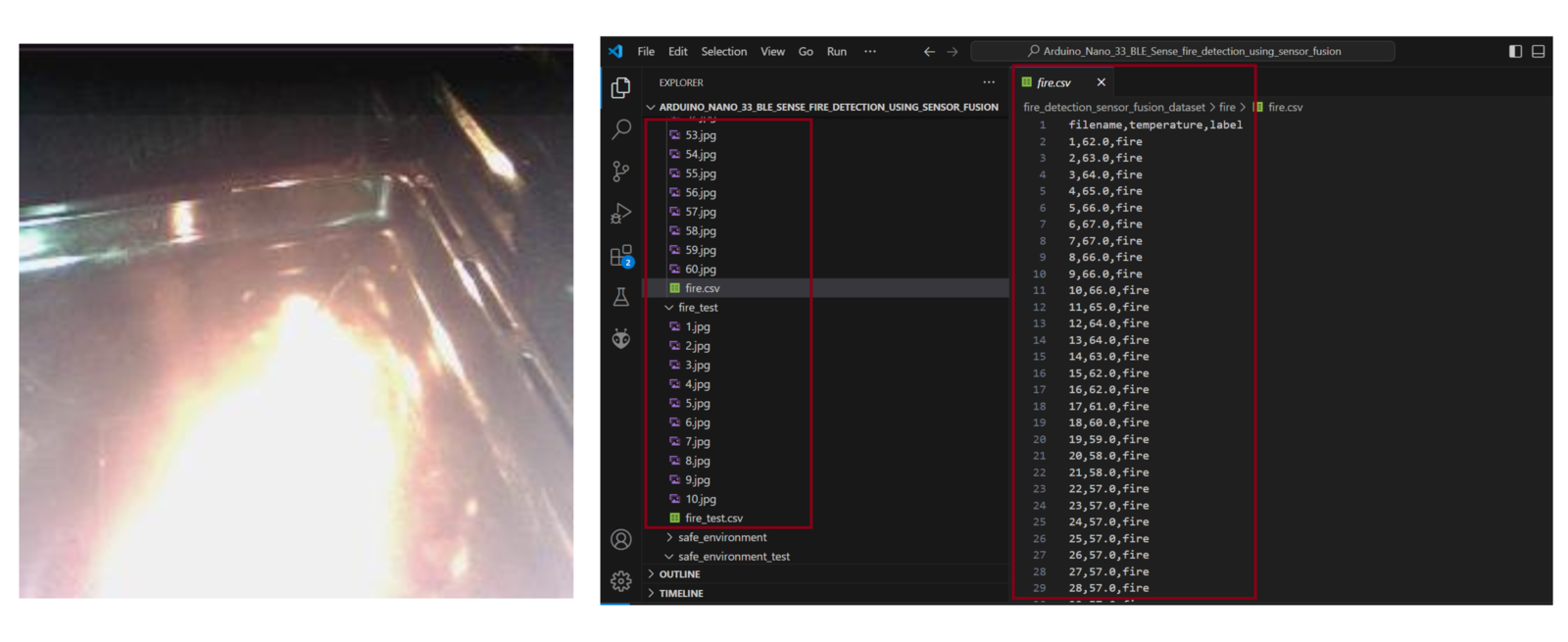 dataset_class variable to "fire" and this makes the Python script save the images and .CSV file to a folder named fire. Since the HTS221 is only guaranteed to operate over a temperature range from -40 to +120 degrees Celsius, I did not put the Arduino board inside the oven to prevent overheating and damaging the board. In this case, the board recorded temperatures of 60 to 70 degrees Celsius while it was next to the oven, placed on the oven door.
