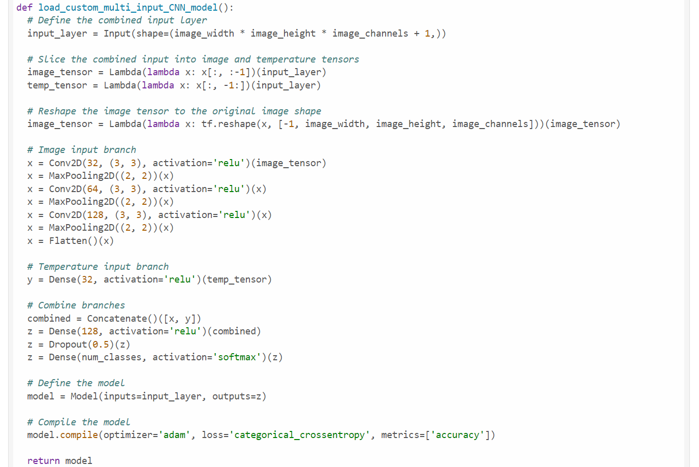 fire class. I replaced half of the images and temperature values with the one’s obtained in the safe environment class. In this case, the model was able to better understand the relationship between the two inputs. A fire can be seen but the temperature value being recorded is as low as 20 degrees. In this case, the temperature sensor may not be within a good range of the fire. At the same time in an environment with fire, no flames may be seen but the temperatures may be as high as 70 degrees. The flame may not be detected by the camera but the high temperature can be felt.