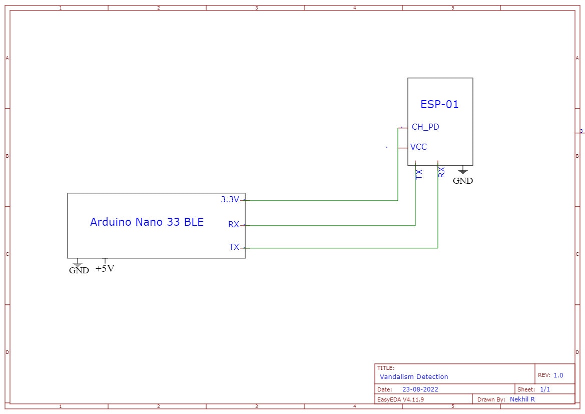 The complete hardware unit consists of the Arduino Nano 33 BLE Sense, power adapter, and an ESP-01. The ESP-01 is used to add WiFi connectivity to the Arduino. This component handles sending email alerts over a designated WiFi connection. This occurs via serial communication between the Arduino and ESP-01. In order to establish this communication, we first need to upload the necessary code to both the ESP-01 and the Arduino, which can be found in the GitHub repository linked below. Afterwards, we connected the components according to this schematic: