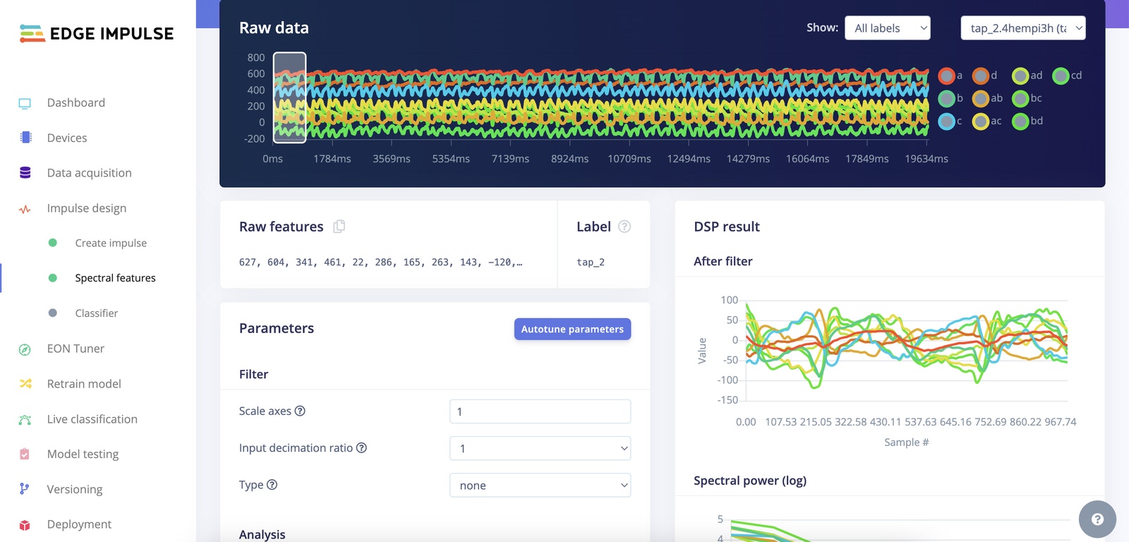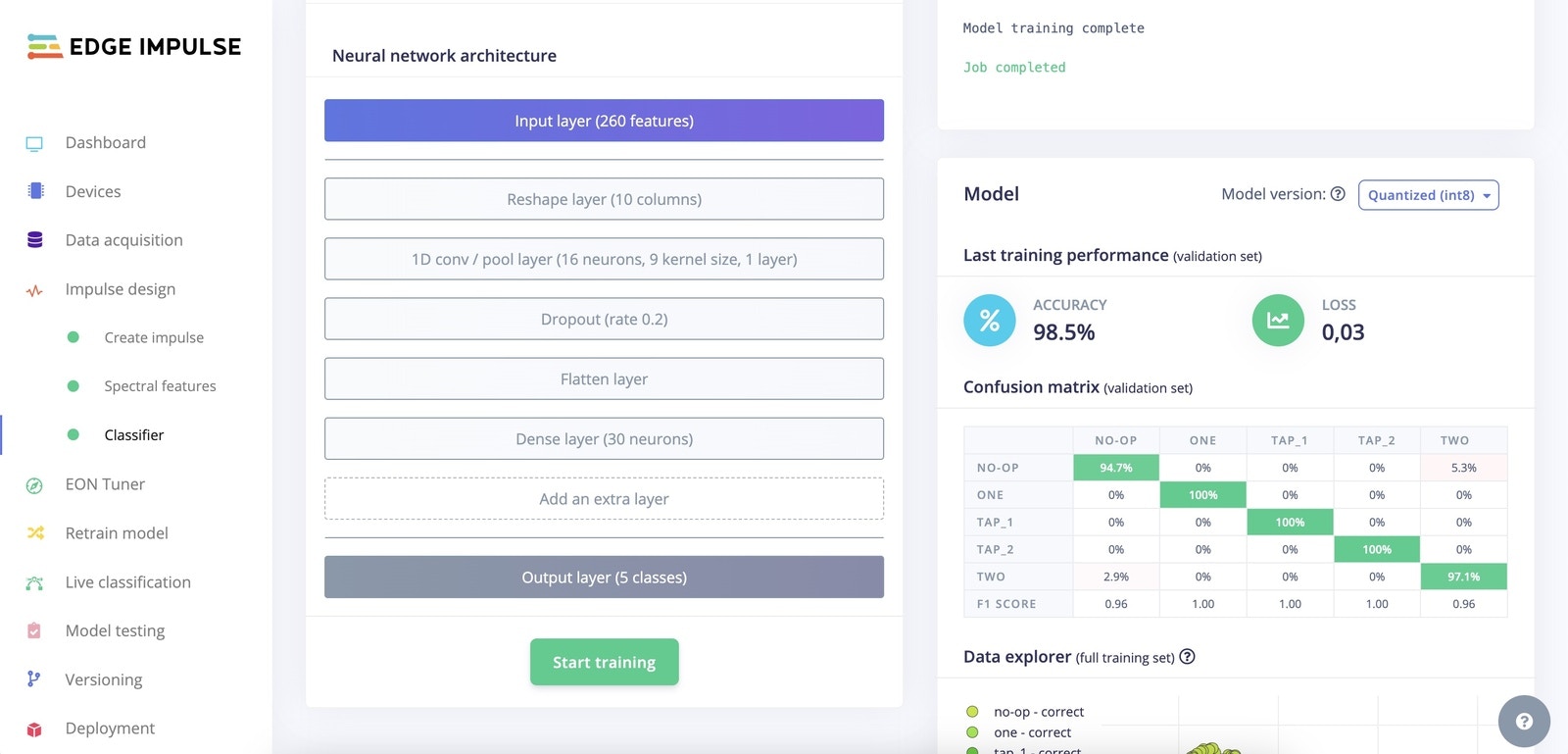 Our data is a multi-axis time series. This usually means the processing block will be made of Spectral Features (FFT frequencies and their power spectrum). For the Classifier, I opted for a fully connected network with 2 layers. As you can see from the confusion matrix, you can expect to achieve a very high score on all the gestures.
