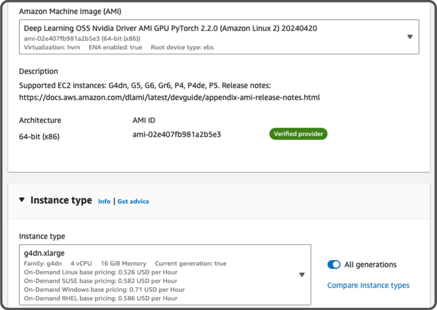 For our setup, we’ll use a pre-configured AMI with PyTorch named Deep Learning OSS Nvidia Driver AMI GPU PyTorch 2.2.0.
