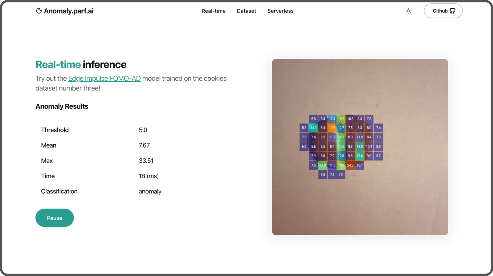 - A real-time inference using a compact version of the Edge Impulse mobile client with FOMO-AD.