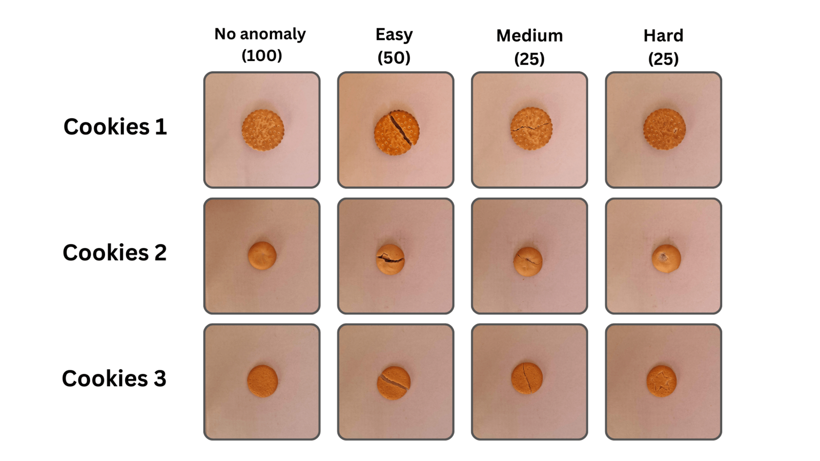 Imagine we are a commercial baking company that produces cookies. Our goal is to sort cookies to identify those with and without defects (anomalies), so that any broken cookies do not get packaged and sent to retailers. We are developing a cloud-based proof-of-concept to understand the feasibility of this technique, before deploying it on edge devices. Although this is only a hypothetical example and demonstration, this quality inspection process and computer vision workflow could absolutely be leveraged by large-scale food service providers, commercial kitchens that make packaged retail food items, or any many other mass-produced retail products even beyond the food industry.Step 1: Create the Datasets
