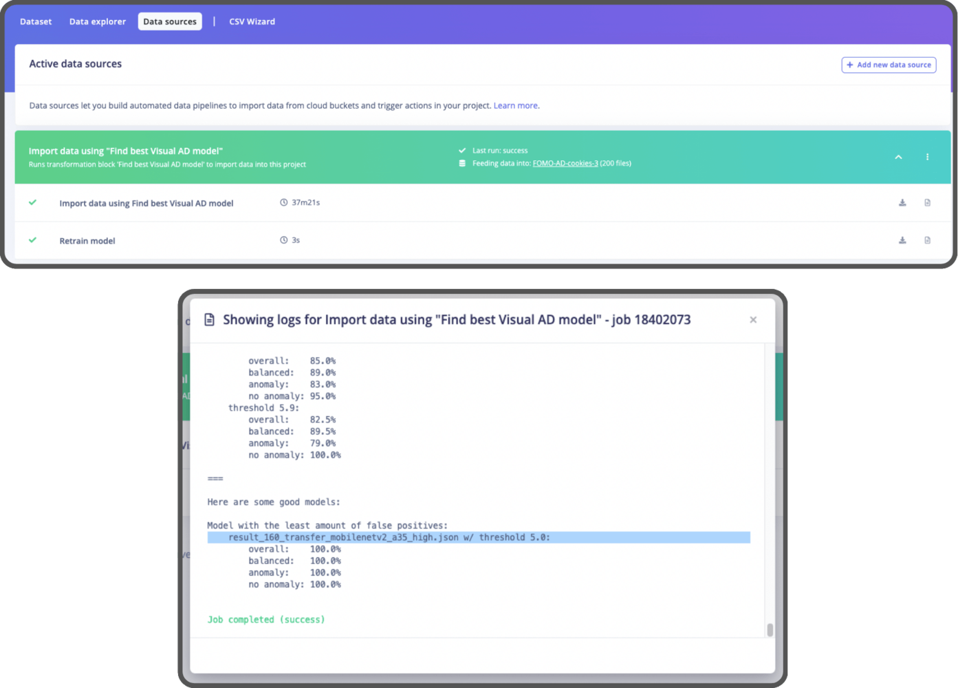 using our dataset. All you need to do is provide the dataset and run the pipeline. After that, you’ll have the optimal model set up in your project, and you can find the best threshold to use in the logs (Refer to the Option 2