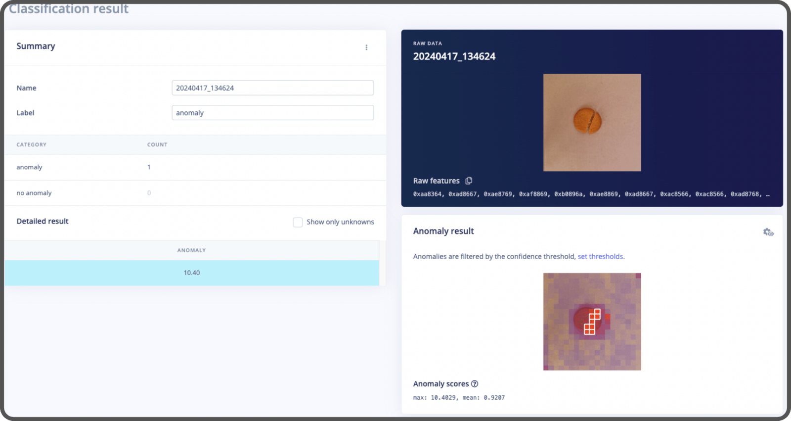 Here’s an example of the inference results with EfficientAD. It localizes the anomaly within the image through a heatmap.
