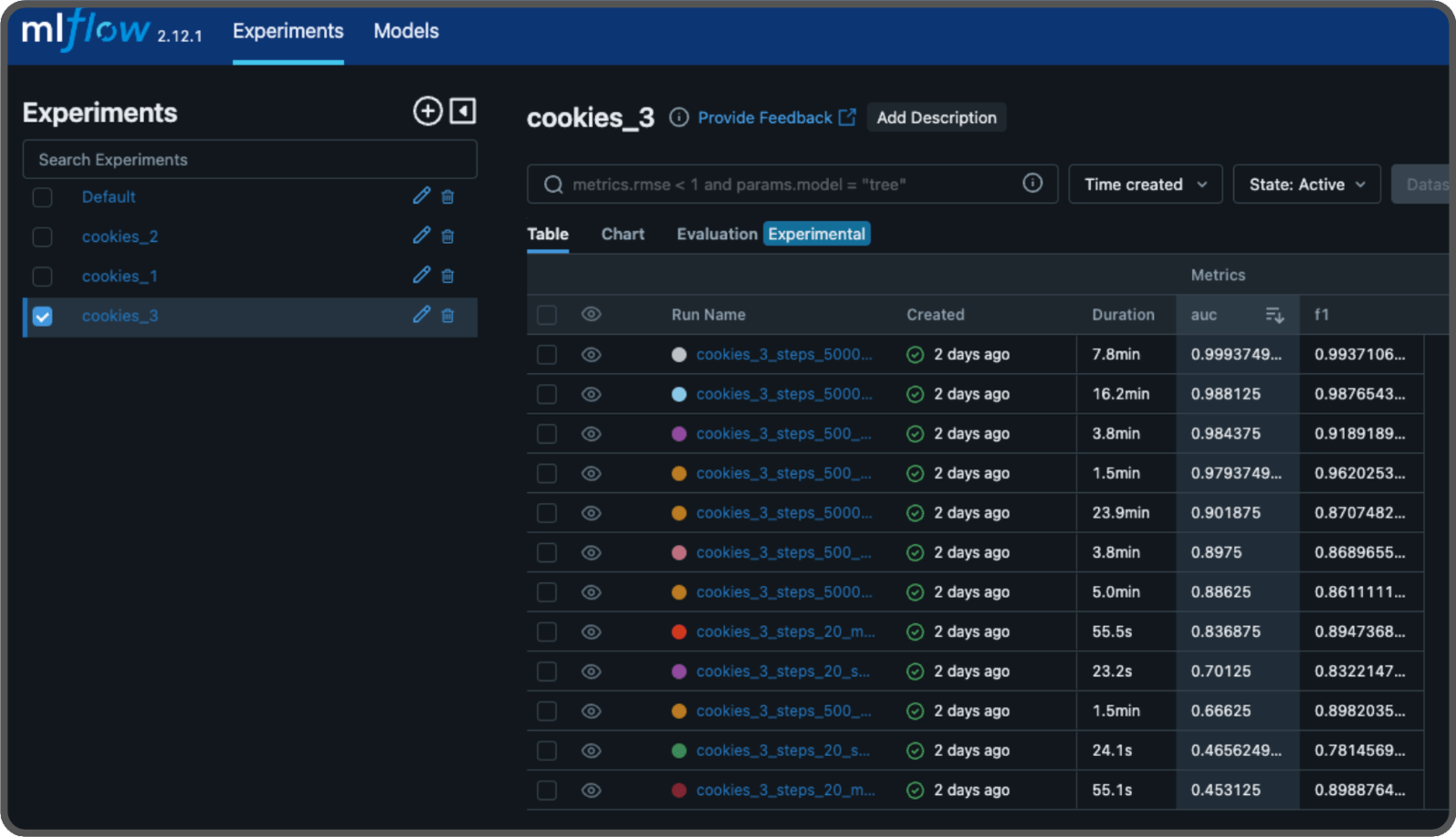 We will test different parameters to build a model that performs well. In the study, they used 70,000 iterations (steps) and pretrained weights from WideResNet-101. We will experiment different numbers of steps, enabling or disabling the pretrained weights and using the small or medium size of the patch description network (the medium size includes another layer and twice as many features). Each test is called an experiment, and we will use MLFlow to log the parameters and store their results, including the scores and the models. To run a MLFlow server, either locally or remotely, use the following command:--artifacts-destination argument to specify where to store our models. You can omit this argument if you’re not using a S3 bucket on AWS, and it will default to storing the models on the disk.