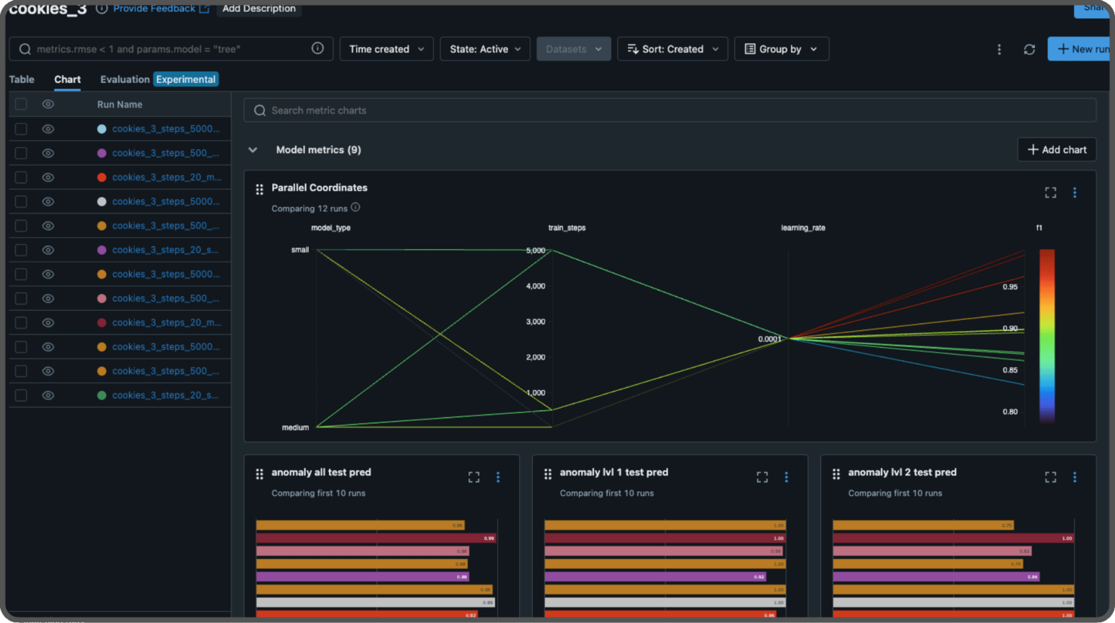 We will test different parameters to build a model that performs well. In the study, they used 70,000 iterations (steps) and pretrained weights from WideResNet-101. We will experiment different numbers of steps, enabling or disabling the pretrained weights and using the small or medium size of the patch description network (the medium size includes another layer and twice as many features). Each test is called an experiment, and we will use MLFlow to log the parameters and store their results, including the scores and the models. To run a MLFlow server, either locally or remotely, use the following command:--artifacts-destination