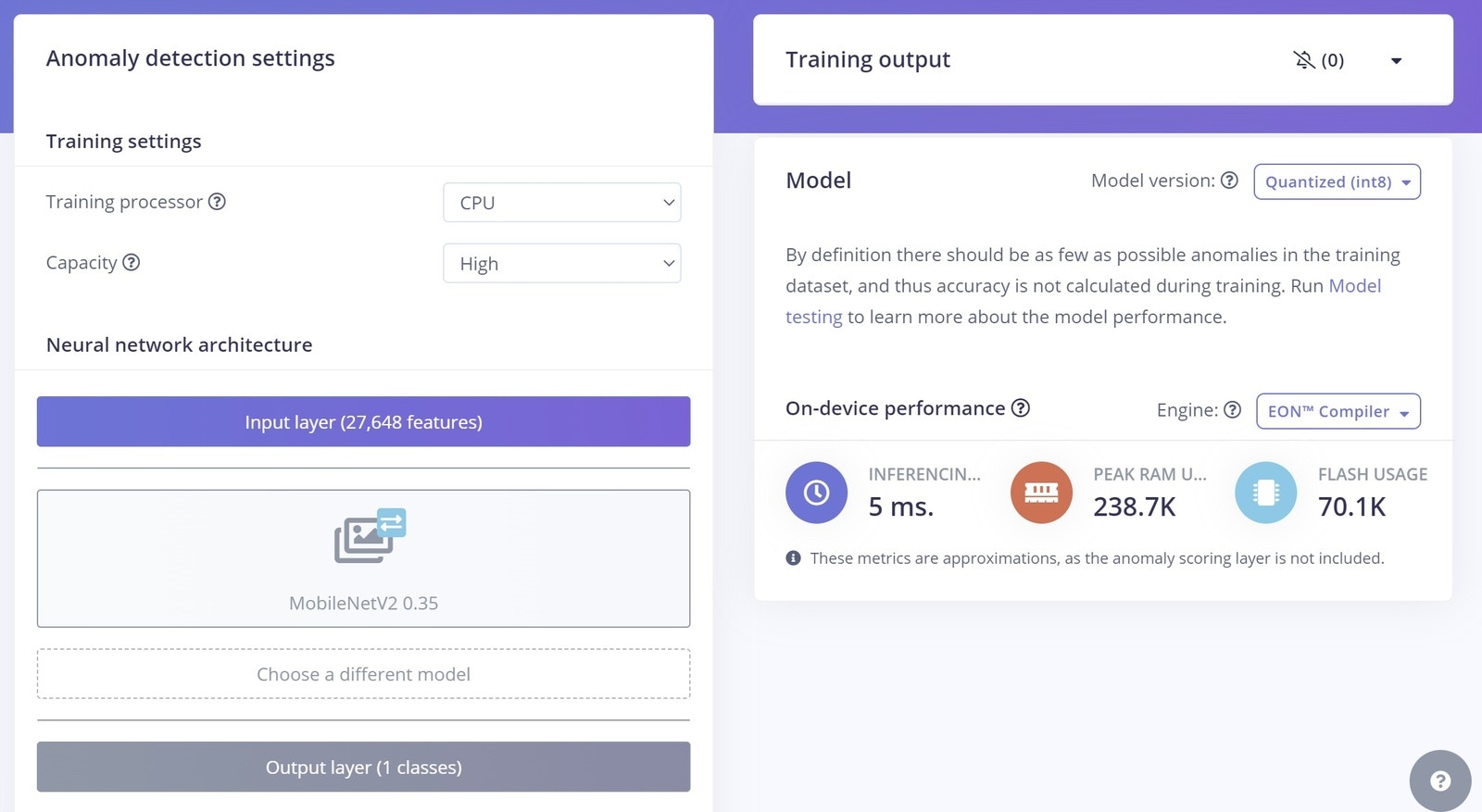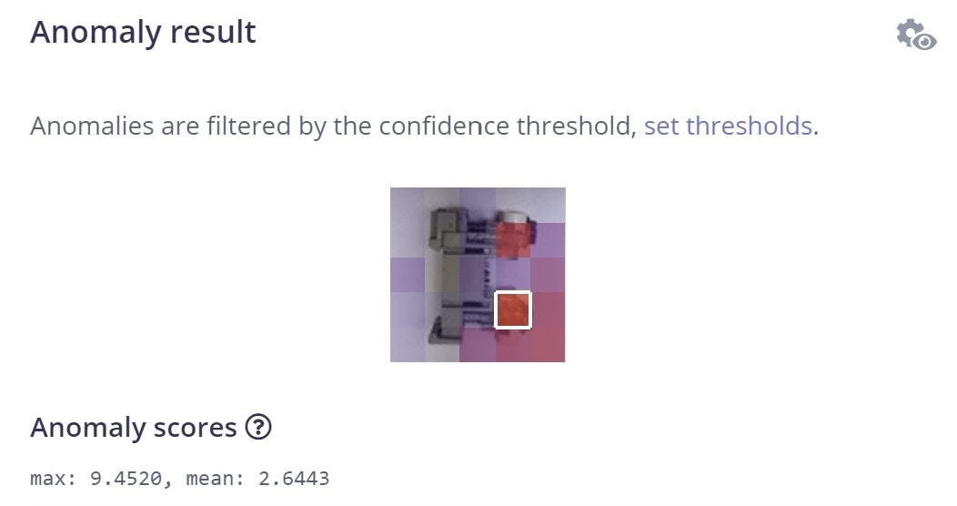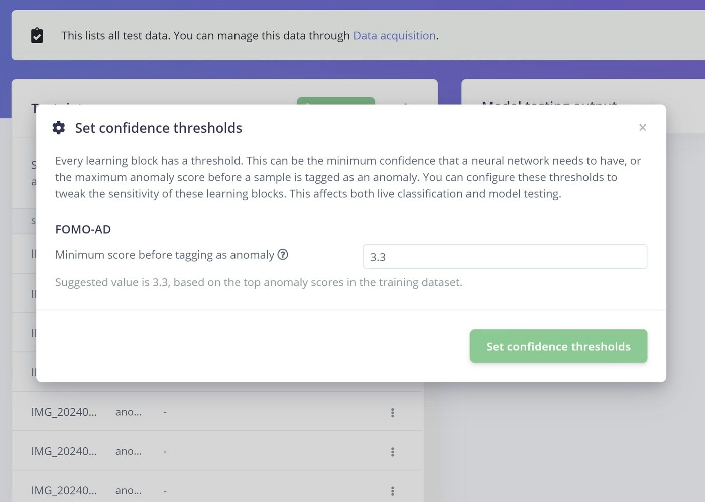 Every learning block has a threshold. This can be the minimum confidence that a neural network needs to have, or the maximum anomaly score before a sample is tagged as an anomaly. You can configure these thresholds to tweak the sensitivity of these learning blocks. This affects both live classification as well as model testing.