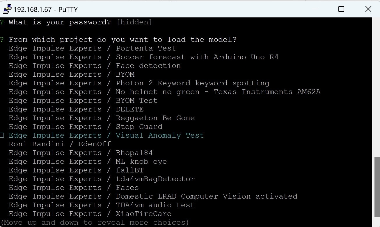Note: the SoC’s built-in AI accelerator (edge-impulse-linux-runner —force-engine tidl —force-target runner-linux-aarch64-tda4vm) does not work yet with Visual Anomaly for this board, but should soon.Log in with your Edge Impulse credentials and select your Edge Impulse project.