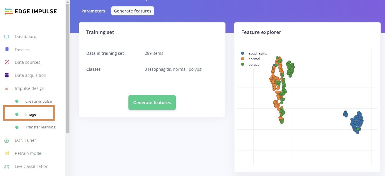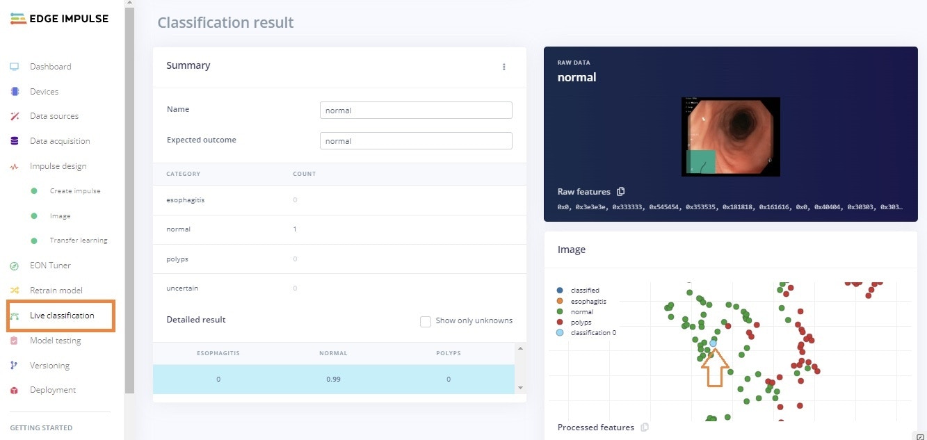 For this project, the publicly available WCE Curated Colon Disease Dataset Deep Learning dataset that is hosted on Kaggle is being used. The dataset contains 4 classes, but only three classes were used here: normal, polyps and esophagitis. Once the data is downloaded from Kaggle, it can be uploaded to Edge Impulse via the Upload data process, which is documented here. The images from Kaggle are already classified, so, they just have to be given the same label in Edge Impulse.