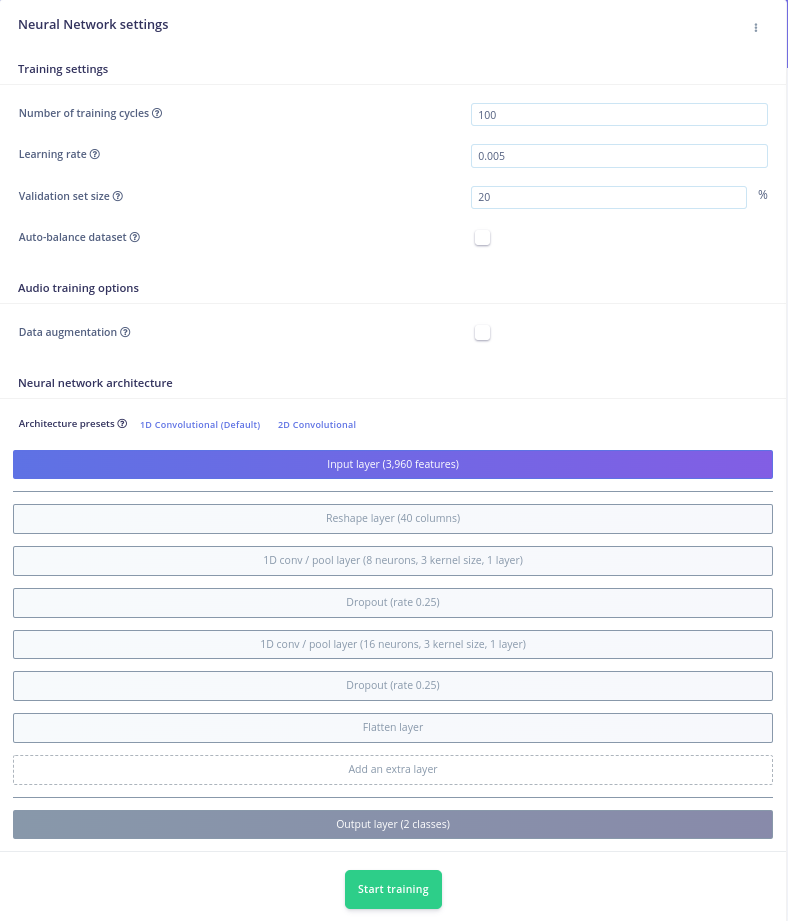 The next step in developing our machine learning algorithm is configuring the NN classifier block. There are various parameters that can be changed: the Number of training cycles, the Learning rate, the Validation set size and to enable the Auto-balance dataset function. They allow you to control the number of epochs to train the NN on, how fast it learns and the percent of samples from the training dataset used for validation. Underneath, the architecture of the NN is described. For the moment, leave everything as is and press Start training.