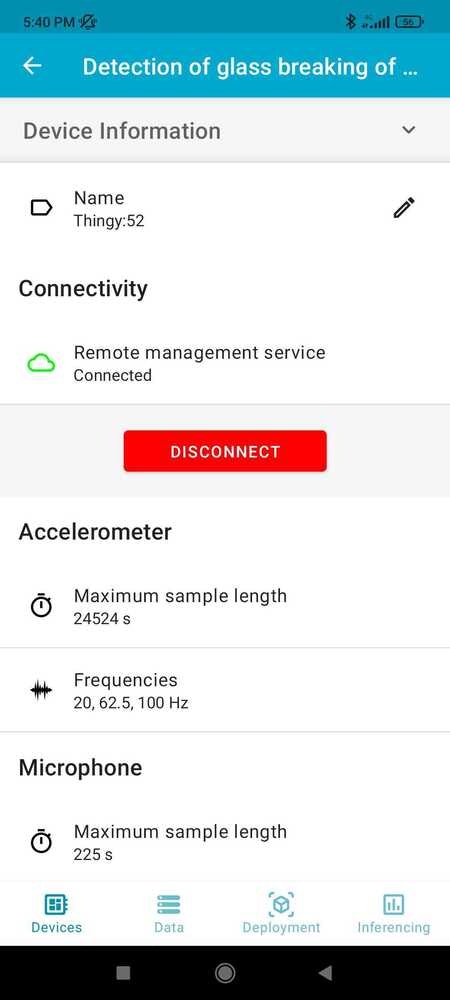 Our approach for those challenges is to create an IoT system based on the Nordic Thingy:53™,development board that will run a machine learning model trained using the Edge Impulse platform that can detect the sound of breaking glass and send a notification via Bluetooth when this event is detected. We have narrowed our hardware selection to the Nordic Thingy:53™ as it integrates multiple sensors (including an accelerometer, gyroscope, microphone, and temperature sensor) onto a single board, which will simplify our data collection process. In addition, the Nordic Thingy:53™ has built-in Bluetooth Low Energy (BLE) connectivity, which will allow us to easily send notifications to nearby smartphones or other devices when our glass/window breaking detection system is triggered. The Nordic Thingy:53 is powered by the nRF5340 SoC, Nordic Semiconductor’s flagship dual-core wireless SoC that combines an Arm® Cortex®-M33 CPU with a state-of-the-art floating point unit (FPU) and Machine Learning (ML) accelerator. This will enable us to run our machine learning model locally on the Thingy:53, without needing to send data to the cloud for processing.