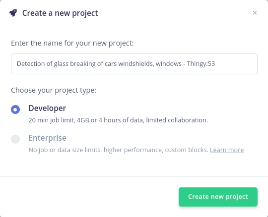 Let’s start by creating an Edge Impulse project. Select Developer as your project type, click Create a new project, and give it a memorable name.