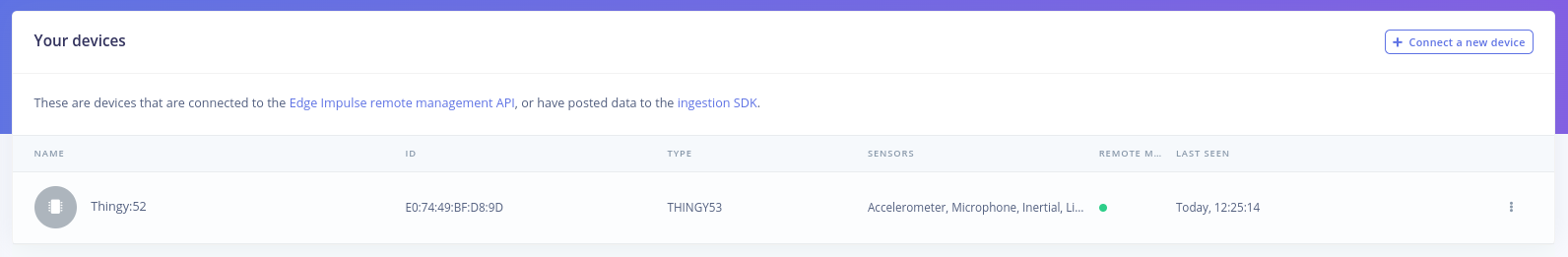 You will notice that another menu pops up that allows you to opt in if you want to enable EON Compiler. We will get back to this later, for now click Build and wait for the process to end. Once it’s done, download the .hex file and follow the steps in the video that shows up to upload it on the Thingy:53 board. With the impulse uploaded, connect the board to your computer, launch a terminal and issue the following command to see the results of the inferencing:Upload the Impulse via Android/IoS App