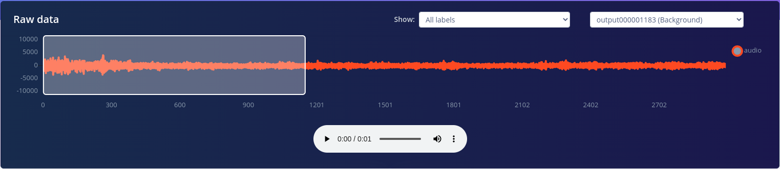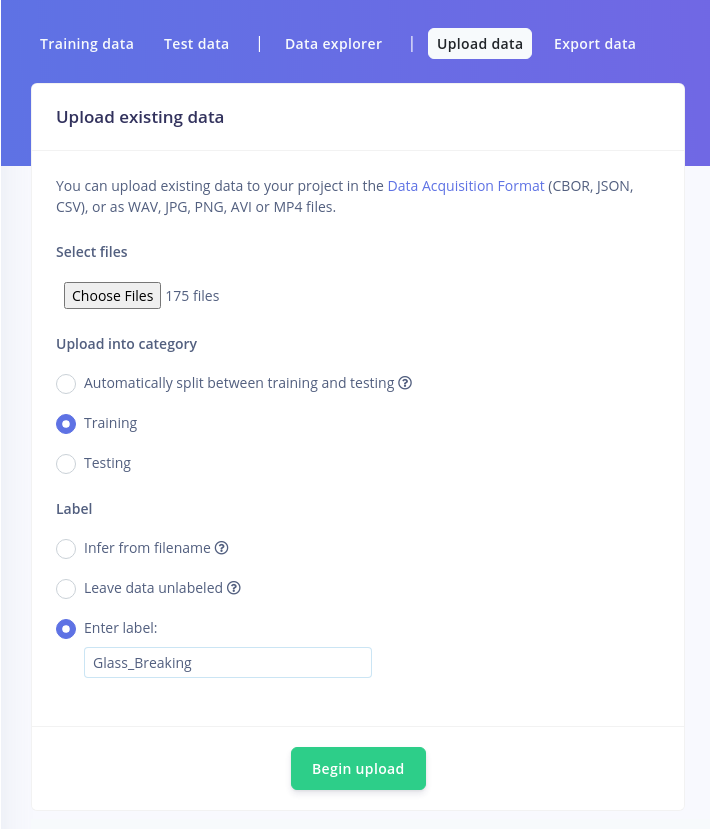 For this particular use case, recording data containing glass breaking sounds is challenging. For such situations, Edge Impulse offers its users the possibility of uploading publicly available recordings of various phenomena that can be post-processed in the Data Acquisition tab. We have gathered over 15 minutes of glass shattering sounds from various license-free SFX sound effects websites and we have uploaded them in our training data pool, using GlassBreaking as their Label. This can be done by navigating to the Upload data tab.