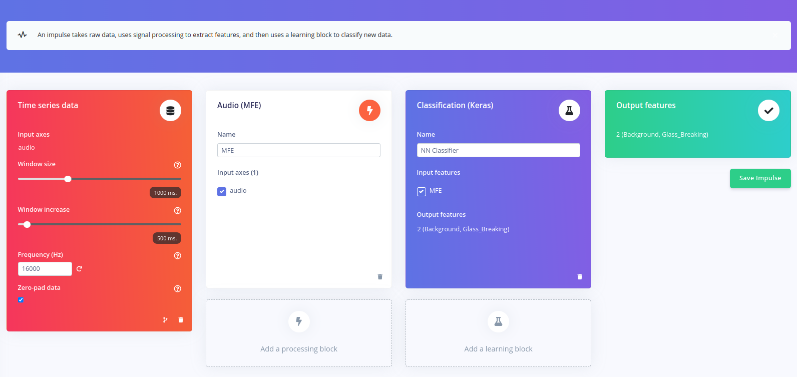Now that the data is available, it’s time to create the Impulse. The functional Block of the Edge Impulse ecosystem is called “Impulse” and it fundamentally describes a collection of blocks through which data flows, starting from the ingestion phase and up to outputting the features.