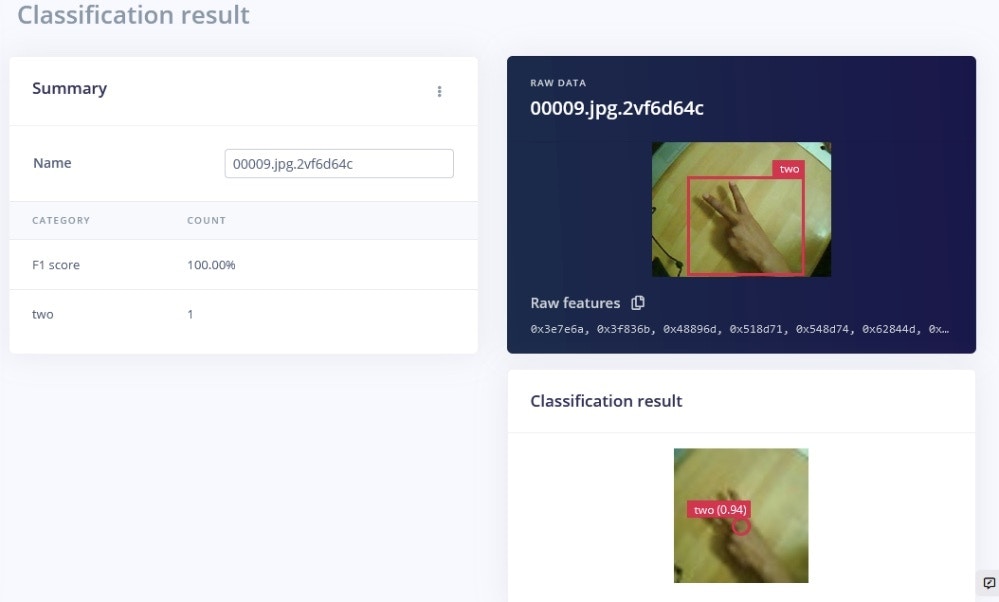 To test the model, images of hand gestures were split during the processing steps. Through the live testing on Edge Impulse’s website, the input image was taken as a parameter and is able to predict the class it belongs to. Before passing the image, we need to ensure that we are using the same dimensions that we used during the training phase. Here, the image is by default the same dimension. Figure 10 represents the results of different class live testing. Figures 11 and 12 represent device testing results for two different classes.