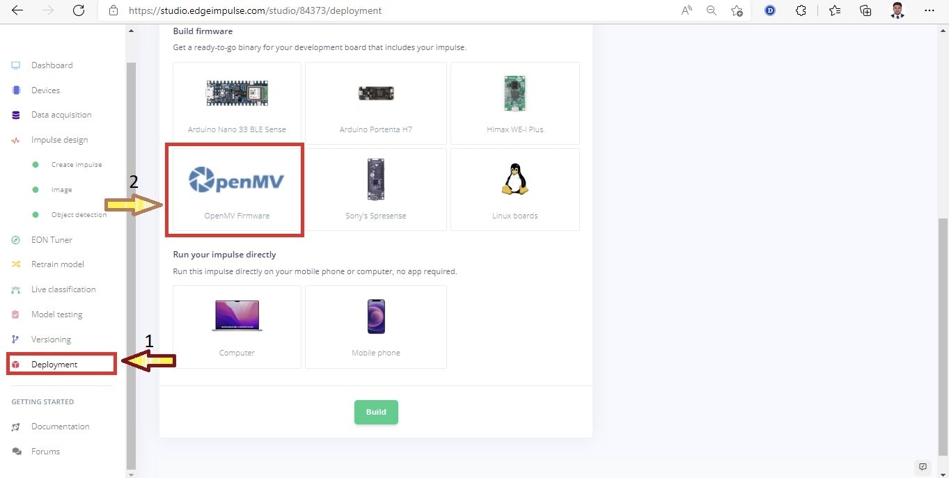 In order to deploy a model on a microcontroller, Figure 8 represents the block diagram. The red bounding box is the steps where first model is trained on given data, after that model is converted to a tflite file then deployed on a microcontroller. Here in our case, we must build firmware using the Edge Impulse platform. Figure 9 represents the steps for OpenMV with red bounding boxes. Impulses can be deployed as a C++ library. You can include this package in your own application to run the impulse locally. We will have three files in the zip folder from Edge Impulse: a python micro script, label as txt and tflite file. Once we have the tflite file we can deploy that on our microcontroller. In our case, we use OpenMV. Copy the tflite and label file from folder. Next, paste it into OpenMV disk and open python micro script file in OpenMV IDE and start inference. For further details of OpenMV development refer to [5].