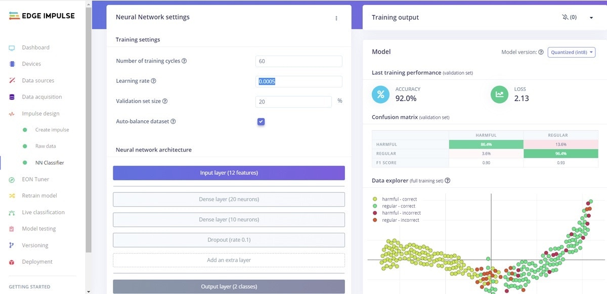 Go to Impulse Design, Create Impulse. In Times Series Data, use 1500ms Windows Size and 0,6 frequency. Processing block will be raw data with all axis checked. For classification use Keras with 2 output features: regular and harmful. In Raw Data you can see all values for regular and harmful inside every windows size. Then you have to click Generate Features. For NN Classifier use 60 training cycles, 0.0005 Learning Rate, Validation 20 and Autobalance dataset. Add an extra layer Dropout Rate 0.1 Click Start Training and check if you get good accuracy. If you are ok with results you can go to Model Testing and check the performance with new data. If there are lots of readings with wrong classification you should check again data acquisition procedure.