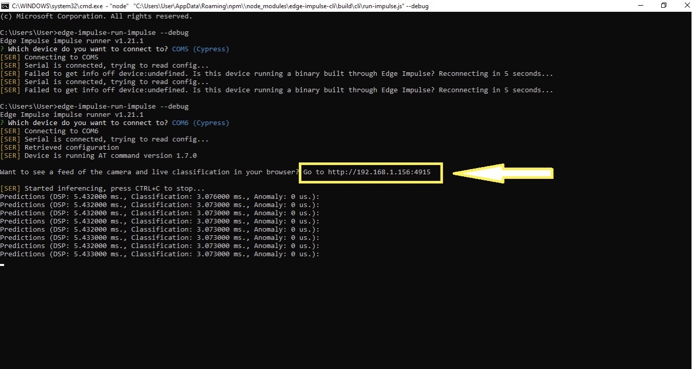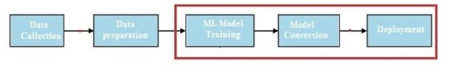 For the deployment of our proposed approach, we select Alif Ensemble E7 from the selection box. The Ensemble E7 utilizes ARM’s low power Cortex-M55 CPUs with dedicated Ethos-U55 microNPUs to run embedded ML workloads and FOMO object detection architecture. The Ensemble E7 kits feature multiple core types, dual MEMS microphones, accelerometers, and a MIPI camera interface. The figure below represents the process to deploy a model on a microcontroller. The red bounding box is the steps where the first model is trained on given data, after that the model is converted to a.tflite file, then deployed on a microcontroller. Here in our case, we have to build firmware using the Edge Impulse platform. After the block diagram the second figure below represents the firmware build steps for Alif, with a red bounding box. Once you have the firmware file downloaded from the Edge Impulse Studio, follow the instructions and commands from the Configuration section above, then run ‘edge-impulse-run-impulse —debug’ for inference on the device.