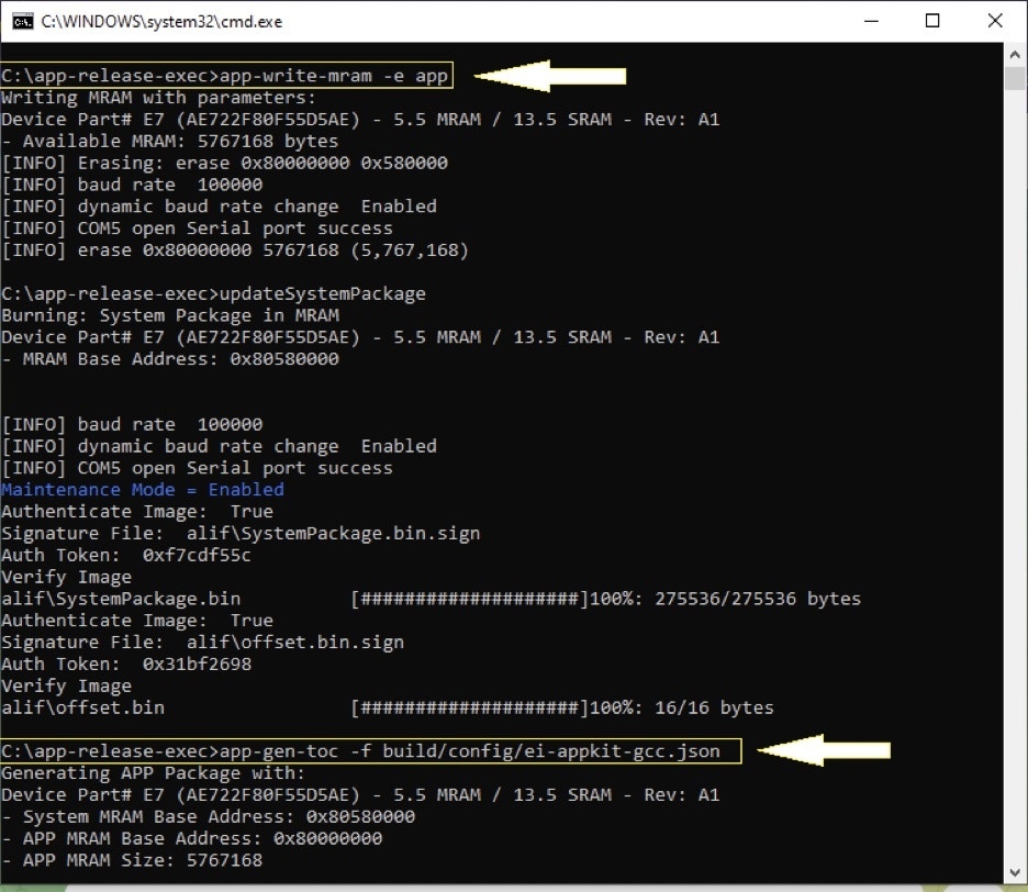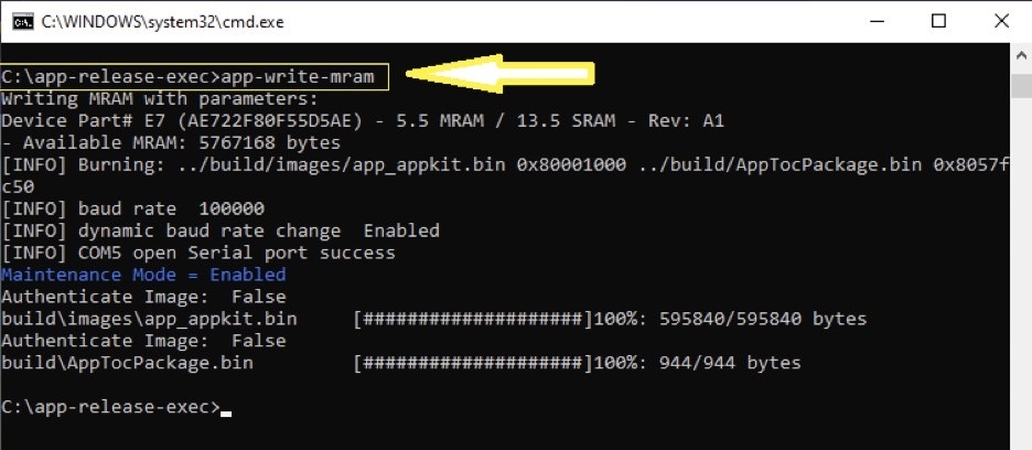SETOOLSdirectory (the default is C:\app-release-exec) and running: a.app-gen-toc -f build/config/ei-appkit-gcc.jsonb. Then erase the application part of MRAM by running:app-write-mram -e appc. Write the image with 3 debug stubs to MRAM by running:app-write-mram