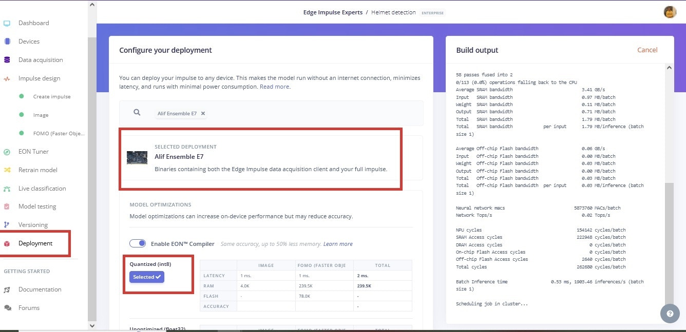 Safety helmets as personal protective equipment are mandatory in a number of industries, including building construction and manufacturing, to avoid potential injuries of workers. Failure to wear safety helmets leads to a higher risk of accidents in industrial environments. In the past, supervisors were responsible for ensuring everyone wore a helmet. However, manual oversight of safety helmets usually results in higher cost and compromised precision due to human factors. Therefore, an application of machine learning using computer vision algorithms for helmet detection proves to be a promising and effective approach. In this project the objective is to enhance safety measures and mitigate potential risks by utilizing a TinyML approach of detecting the presence of hardhats on workers’ heads. This project aims to leverage the Edge Impulse platform to build an efficient and lightweight model that can be deployed on edge devices, enabling real-time monitoring and immediate alerting in case of non-compliance, using the Alif Ensemble E7 development platform.Alif Ensemble E7 Configuration with Edge Impulse