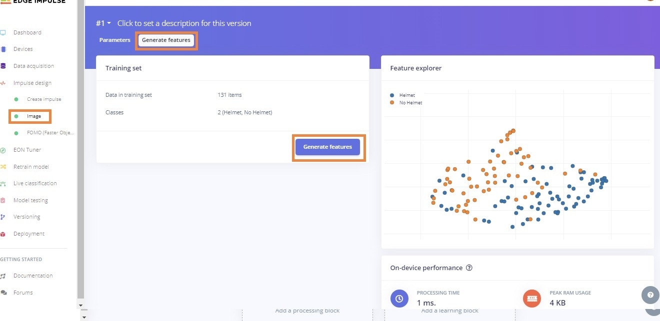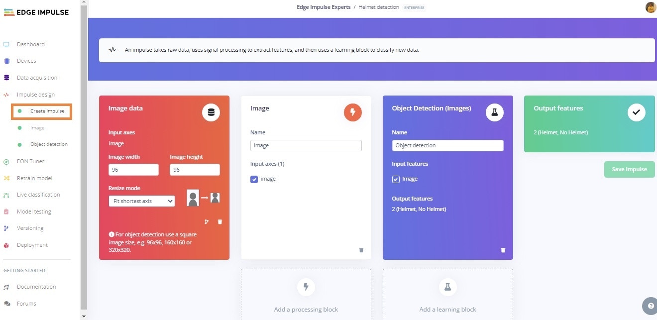 After uploading and labeling is completed, our labeled dataset is prepared to train a model. In this step, by clicking on ‘Create Impulse’ we resize the image dimensions to 96x96 pixels, and ‘Fit shortest axis’ Resize mode. Additionally, we set up the Processing block as ‘Image’ and a Learning block as ‘Object Detection (Images)’.