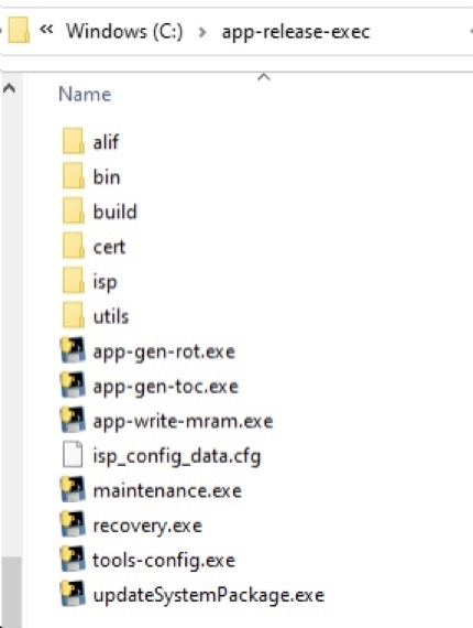 - Follow the procedure to install the Alif Security Toolkit - this can be requested from Alif after registration on their website, which has all the relevant files. Below is the explanation for setting up the hardware once you have these files. a. Unzip the Alif Security Toolkit Release to any directory on your Windows PC or Linux machine. b. The recommended <release-location> installation directories are: i. Windows: C:\app-release-exec ii. Linux: /home/$USER/app-release-exec-linux c. The directory structure is as follows: