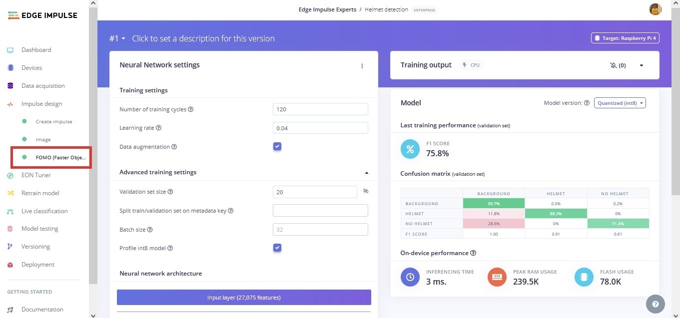 To train the model, the FOMO (Faster Objects, More Objects) MobileNetV2 0.35 algorithm was used, with hyperparameters of 120 epochs, learning rate set to 0.04, batch size set to 32, and ‘Data augmentation’ enabled. Considering the selection of the algorithm, FOMO MobileNetV2 0.35 combines the speed of MobileNetV2 with the detection capabilities of YOLOv5 and MobileNetV2 SSD FPN-Lite. It excels in real-time applications, striking a balance between accuracy and computational efficiency for object detection tasks. Here, the dataset is split into training, validation, and testing. The optimized model’s size was significantly reduced after adding a dynamic quantization that changed the model from a 32-bit floating point to an 8-bit integer.