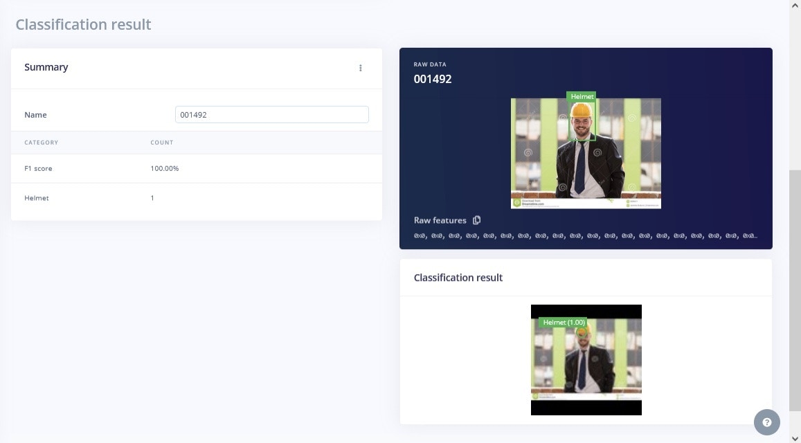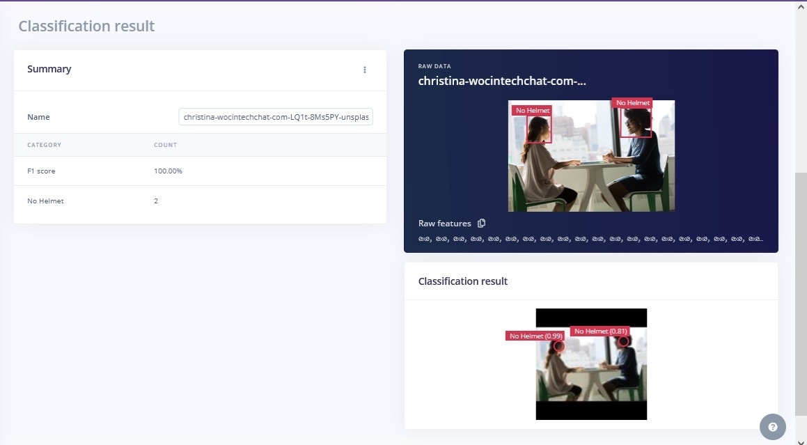 To test the model, images of a person wearing a helmet or not wearing a helmet are needed. The dataset was split earlier, with 20% being set aside for Testing, that can be used now. The Studio takes the input image as a parameter and predicts the class it belongs to. Before passing the image, we need to ensure that we are using the same dimensions that we used during the training phase; here it’s by default the same dimension. You can also test with a live image taken directly from the development board, if you have a camera attached. In this case, we have a low resolution camera with our kit, and lighting is not optimal, so the images are dark. However, with a high resolution camera and proper lighting condition, better results can be achieved. But having another look at the Test dataset images, which are bright and high quality, we can see that the model is predicting results (hardhats) effectively.