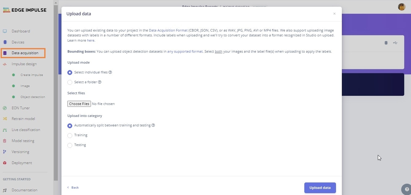 After the device is configured, now the task is to collect data. For this project a comprehensive image dataset was used from a publicly available resource. To train the model, 160 images captured in various industrial settings from the dataset were selected. Then, the data was uploaded to the Edge Impulse platform via the Upload Data process as shown below. The dataset was automatically split between Training (80%) and Testing (20%).