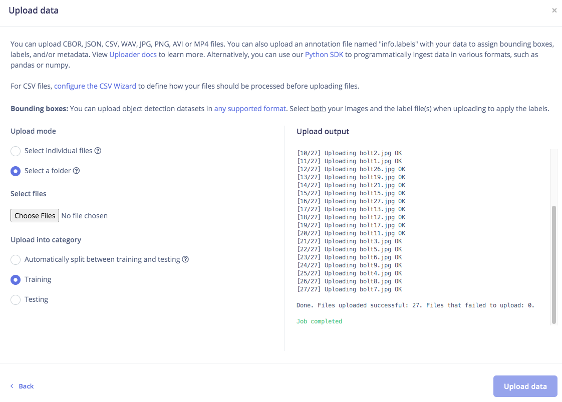 Open studio.edgeimpulse.com, login or create an account then create a new project. Choose the Images project option, then Object detection. In Dashboard > Project Info, choose Bounding Boxes for the labeling method and NVIDIA Jetson Nano for the target device. Then in Data acquisition, click on Upload Data tab, choose your photo files, automatically split them between Training and Testing, then click on Begin upload. Next,- For Developer accounts: click on the Labeling queue tab then drag a bounding box around an object and label it, then click Save. Repeat this until all images labelled. It goes quickly though, as the bounding boxes will attempt to follow an object from image to image.