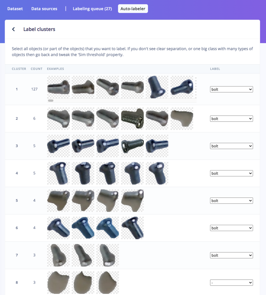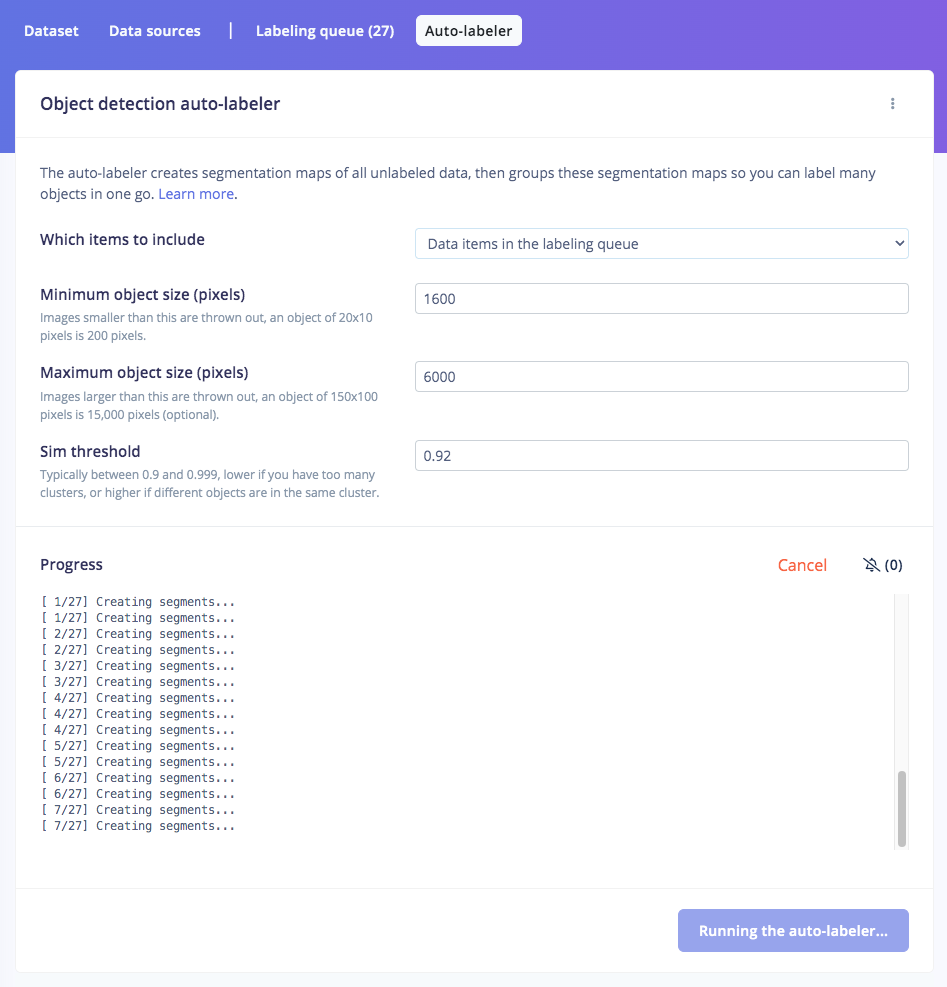 - For Enterprise accounts: click on Auto-Labeler in Data Acquisition. This auto-labeling segmentation / cluster process will save a lot of time over the manual process above. Set min/max object pixels and sim threshold (0.9 - 0.999) to adjust the sensitivity of cluster detection, then click Run. If something doesn’t match or if there is additional data, labeling can be done manually as well.