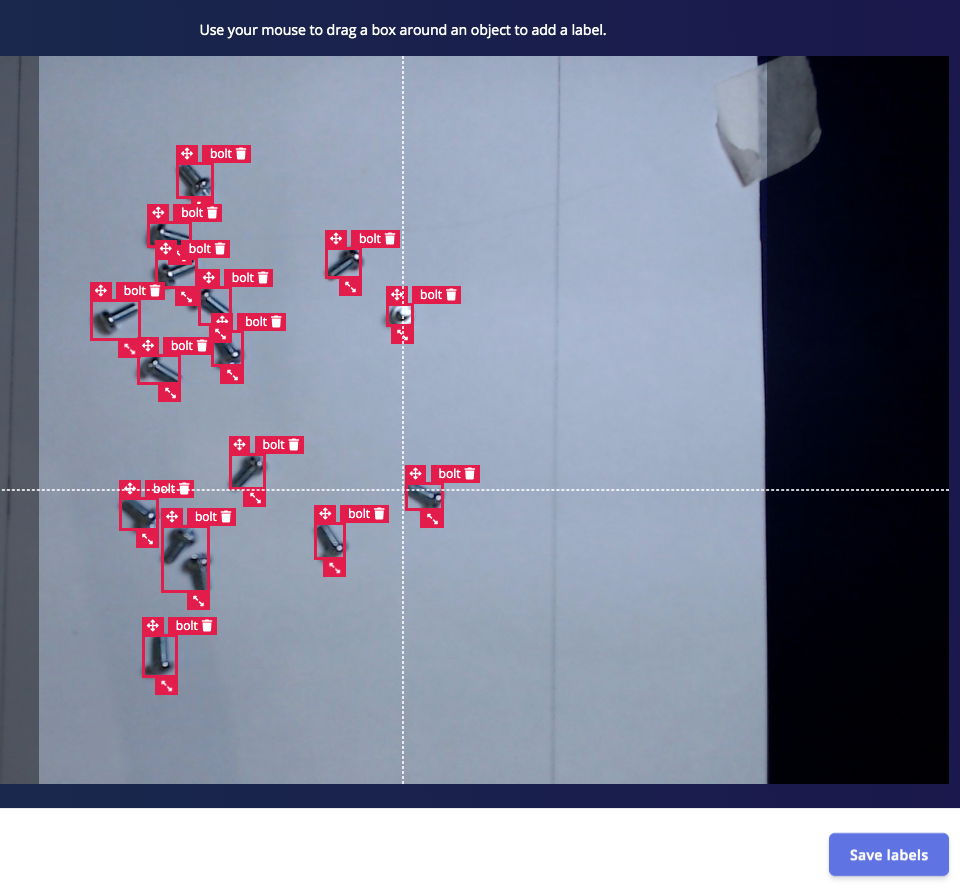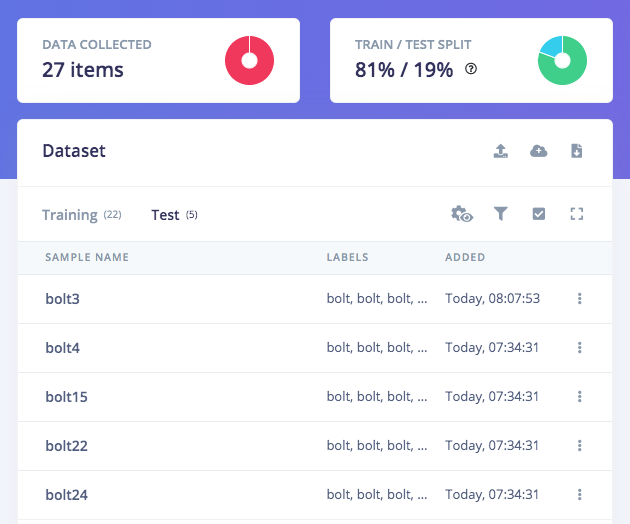 In this project we use a Logitech C922 USB camera capable of 720p at 60 fps connected to a PC/laptop to capture the images for data collection, for ease of use. Take pictures from above the parts, at slightly different angles and lighting conditions to ensure that the model can work under different conditions (to prevent overfitting). Object size is a crucial aspect when using FOMO, to ensure the performance of this model. You must keep the camera distance from the objects consistent, because significant difference in object sizes will confuse the algorithm and cause difficulty in the auto-labelling process.