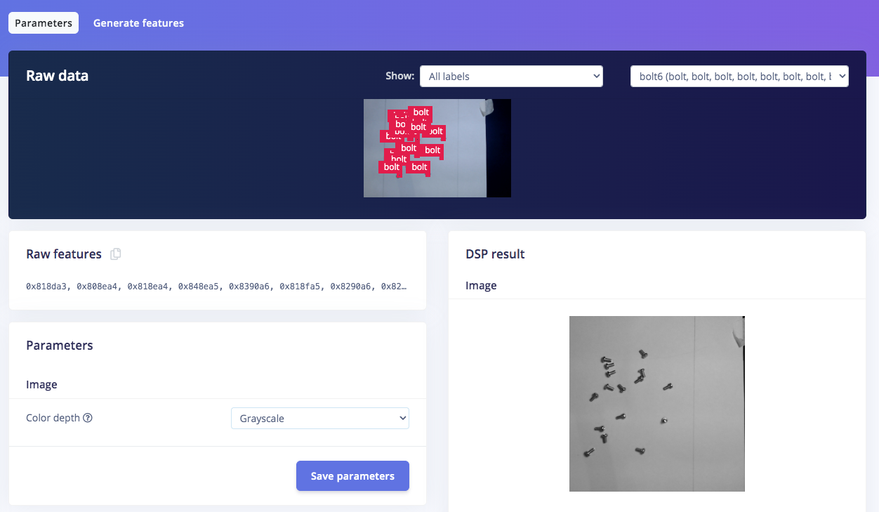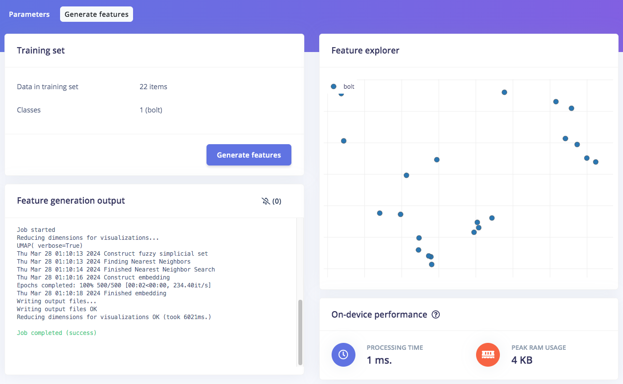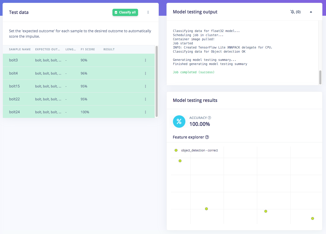 Once you have the dataset ready, go to Create Impulse and set 720 x 720 as the image width and height. Then choose Fit shortest axis, and choose Image and Object Detection as Learning and Processing blocks. In the Image block configuration, select Grayscale as the color depth and click Save parameters. Then click on Generate features to get a visual representation of the features extracted from each image in the dataset. Navigate to the Object Detection block setup, and leave the default selections as-is for the Neural Network, but perhaps bump up the number of training epochs to 120. Then we choose FOMO (MobileNet V2 0.35), and train the model by clicking the Start training button. You can see the progress on the right side of the page. If everything is OK, then we can test the model, go to Model Testing on the left navigation and click Classify all. Our result is above 90%, so we can move on to the next step — Deployment.