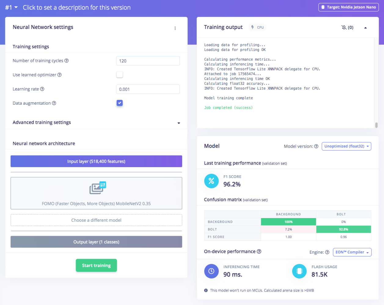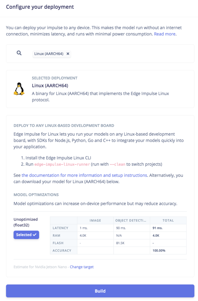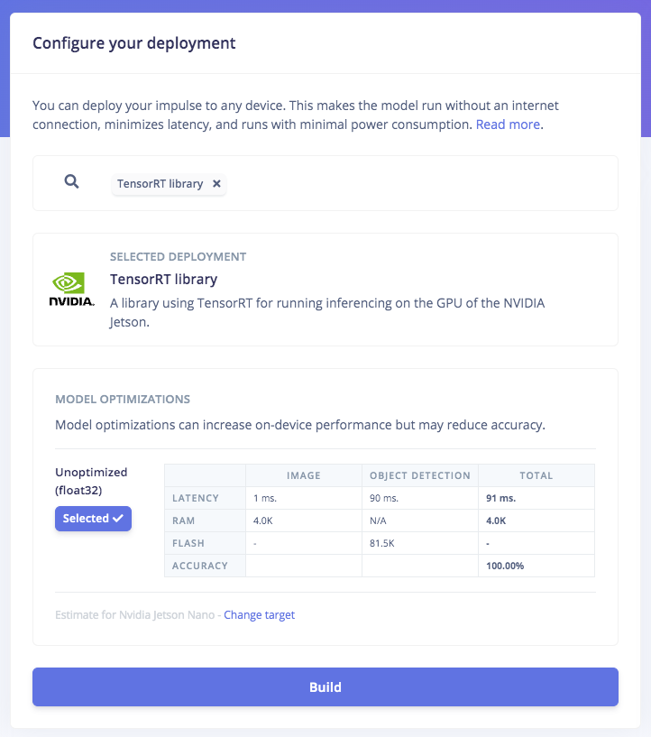 Click on the Deployment navigation item, then search for TensorRT. Select Float32 and click Build. This will build an NVIDIA TensorRT library for running inferencing targeting the Jetson Nano’s GPU. After it has downloaded, open the.zip file and then we’re ready for model deployment with the Edge Impulse C++ SDK directly on the NVIDIA Jetson Nano.