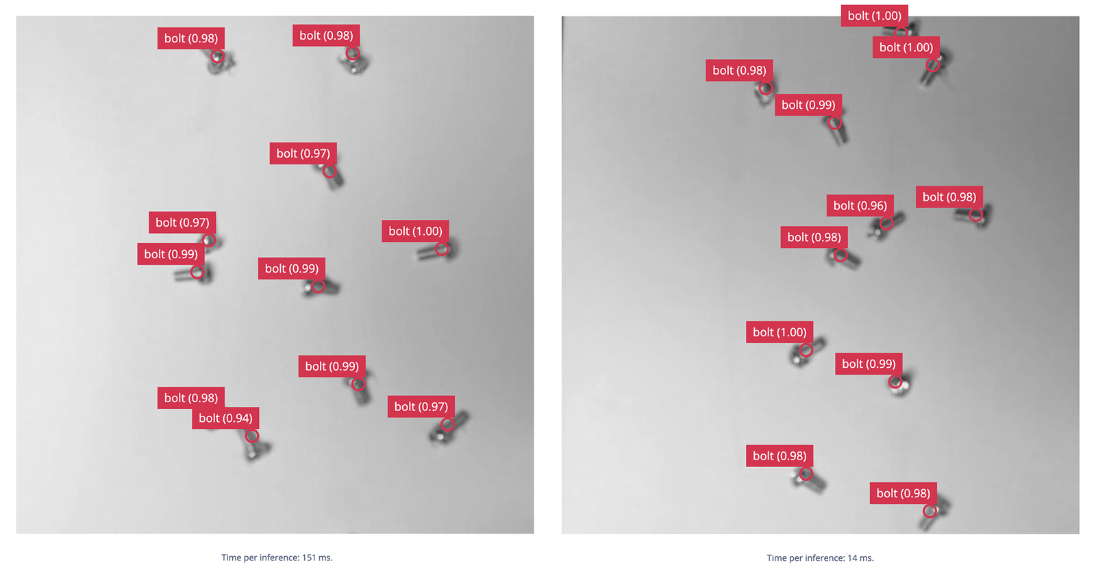 The delay visible in the video stream display and its corresponding output calculation is caused by the OpenCV program rendering a 720x720 display resolution window, not by the inference time of the object detection model. This demo test uses 30 bolts per cycle attached to the conveyor belt to show a comparison with the output on the counter.