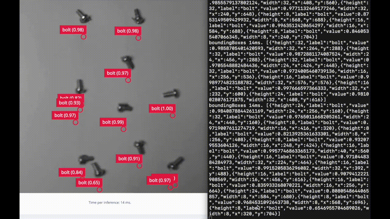 Now the model is ready to run in a high-level language such as the Python program in the next step. To ensure this model works, we can run the Edge Impulse Runner with the camera setup on the Jetson Nano and run the conveyor belt. You can the see the camera stream via your browser (the IP address is provided when Edge Impulse Runner first starts up). Run this command: