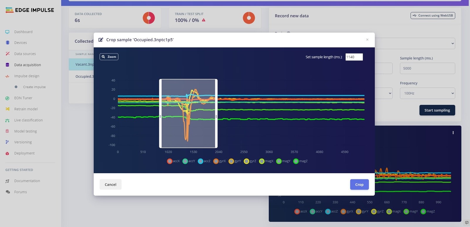 As the samples we took for the Vacant and Occupied classes were taken with a sample length of 5 seconds, we will need to trim them down to around 1 second. To do this, click the three dots at the side of the samples and reduce the length by pulling bars at the edges of the samples closer together. Make sure you get the correct data in the sample. For Vacant, you should have the part of the sample where the signals go up, and vice-a-versa for the Occupied samples.