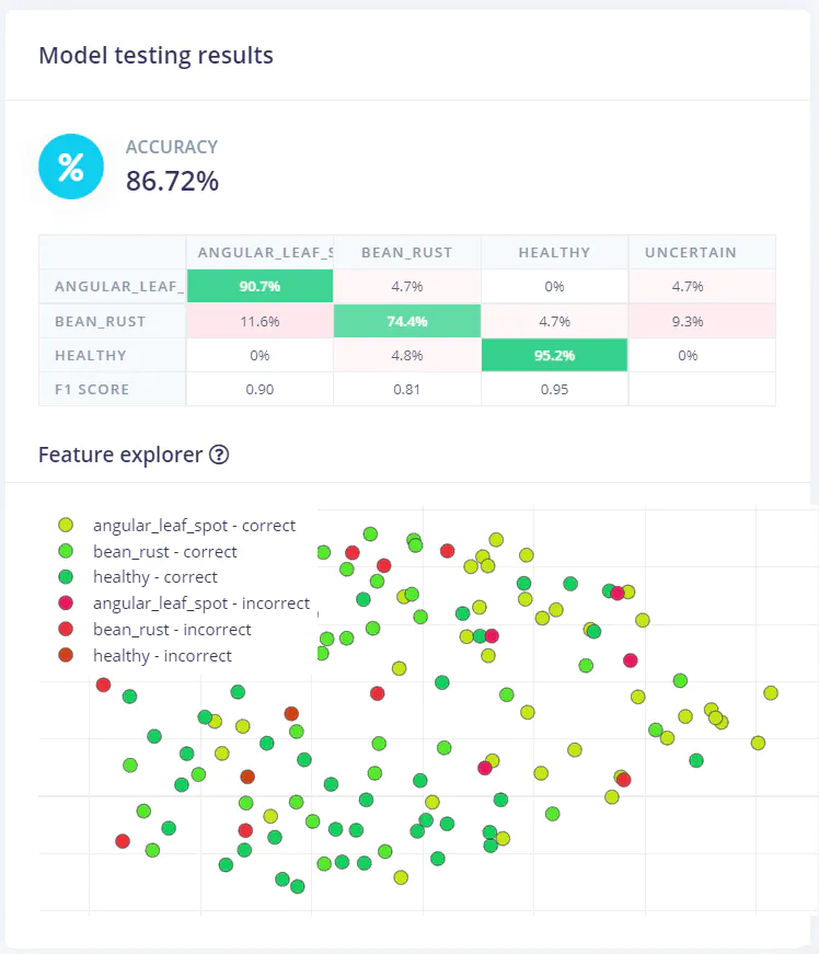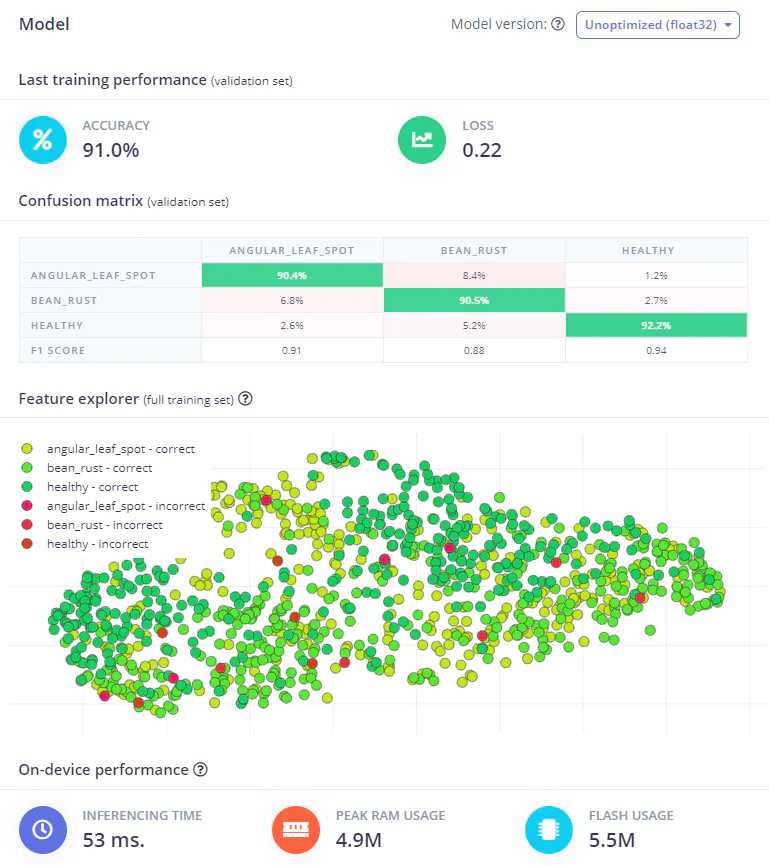 With the data uploaded to the Edge Impulse Studio, we can start training our model. I’m using MobileNet V2 160x160 0.75, with a training cycle of 20 epochs, and a learning rate of 0.0005. I’m able to achieve 91% accuracy, which is great (unoptimized float32).