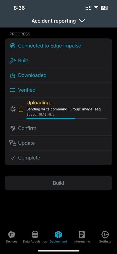 To deploy our model onto the device, back in the mobile App you can simply go to the Deployment tab and click on the Build option. The App will start building our project, and then deploy the firmware directly to our Thingy:53 upon completion.