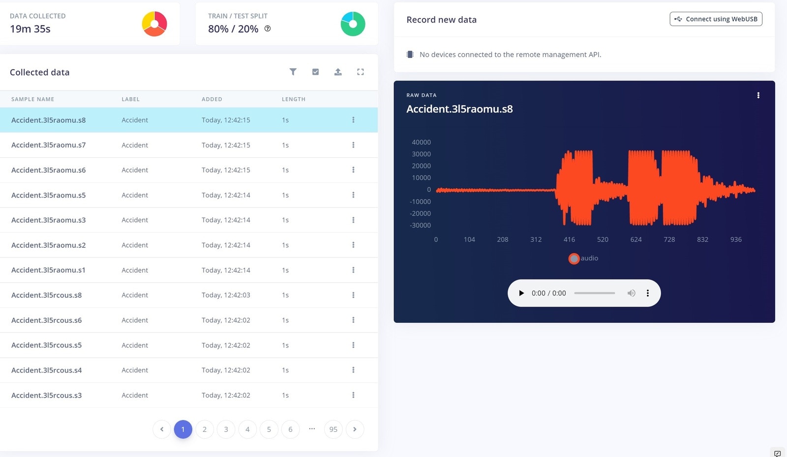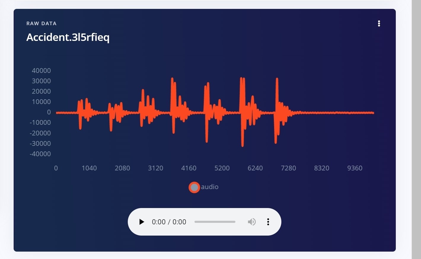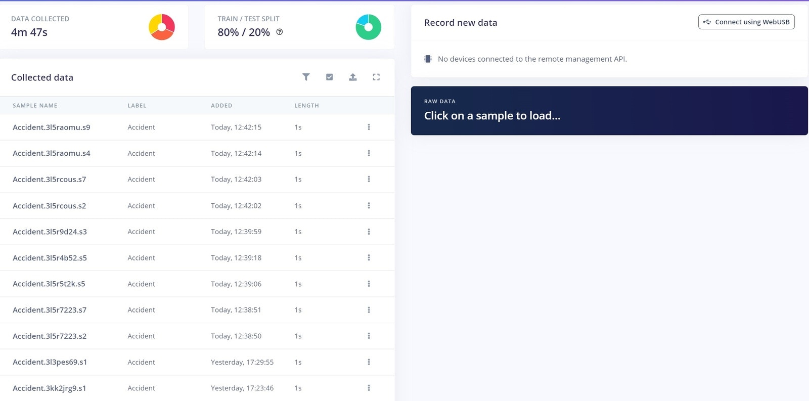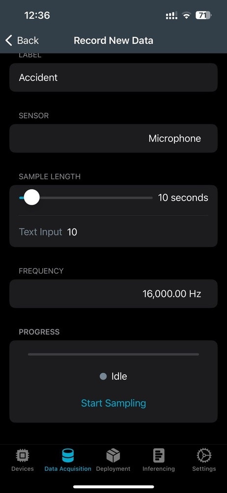 Data Collection is one of the most important steps in a machine learning project. In this project, we used the nRF Edge Impulse app for the Data collection, making it easy to capture input data. The main keyword used here for reporting an accident, is literally the word Accident itself. Below, you can see our data collection settings. We recorded 10 seconds of data, at 16Khz frequency.