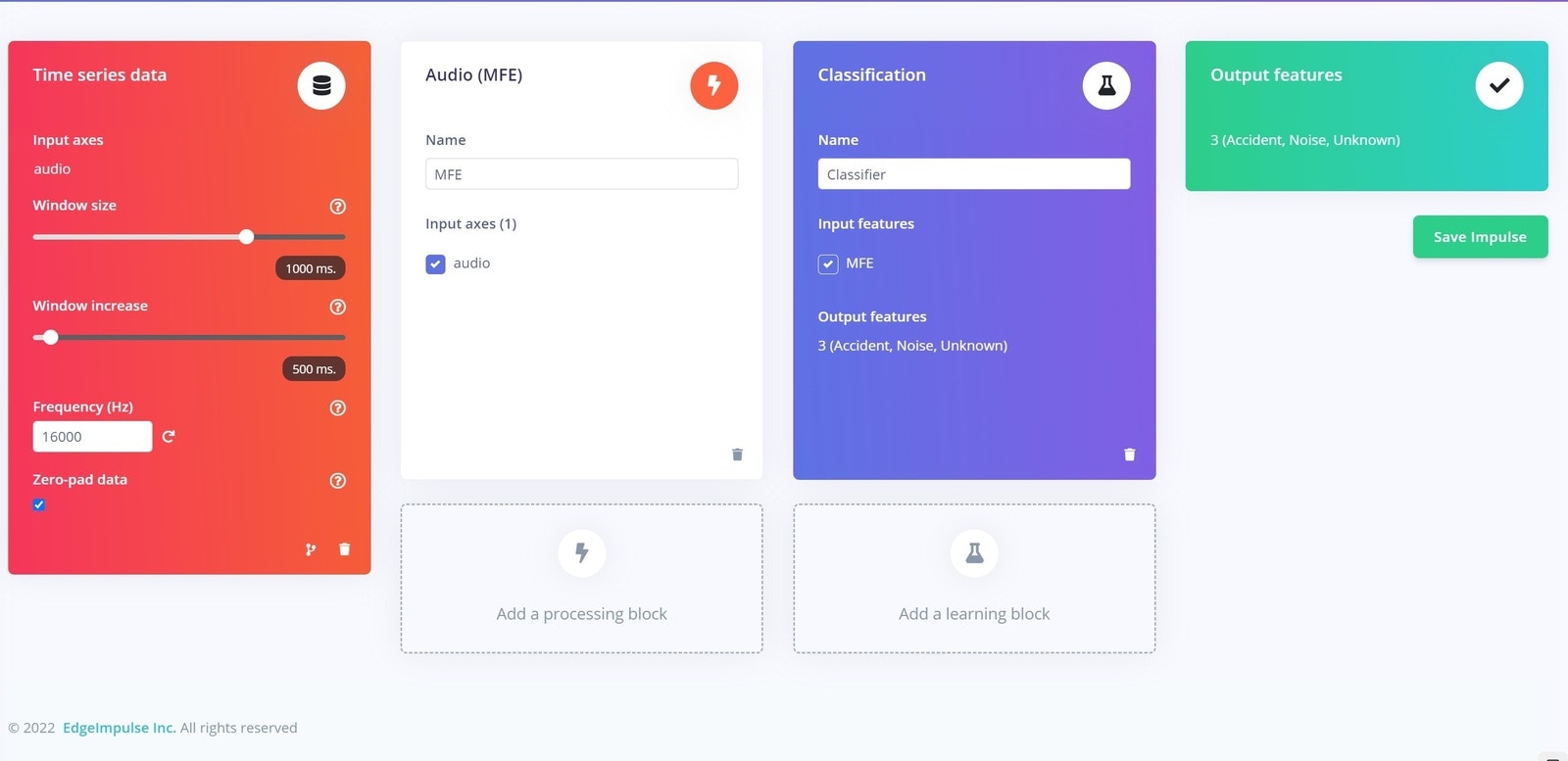 Now it is time to create an Impulse, which is the machine learning pipeline built by Edge Impulse.