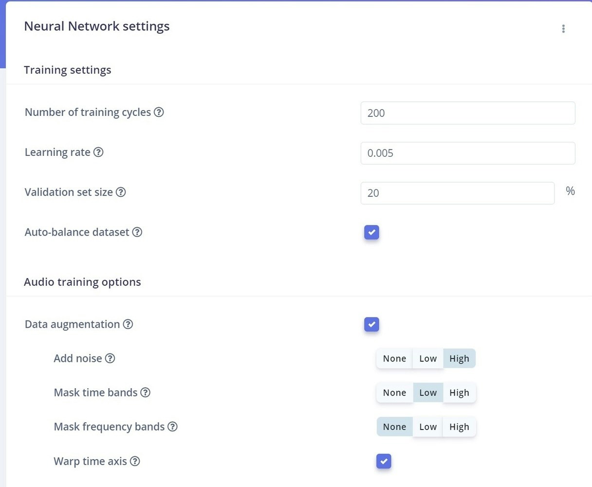 To build our neural network, we simply start by clicking Classifier on the left. The Neural Network default settings might work ok, but you can fine tune them if you need to. More information on the settings can be found in the documentation located here. Here are our neural network settings and architecture, which work very well for our data.