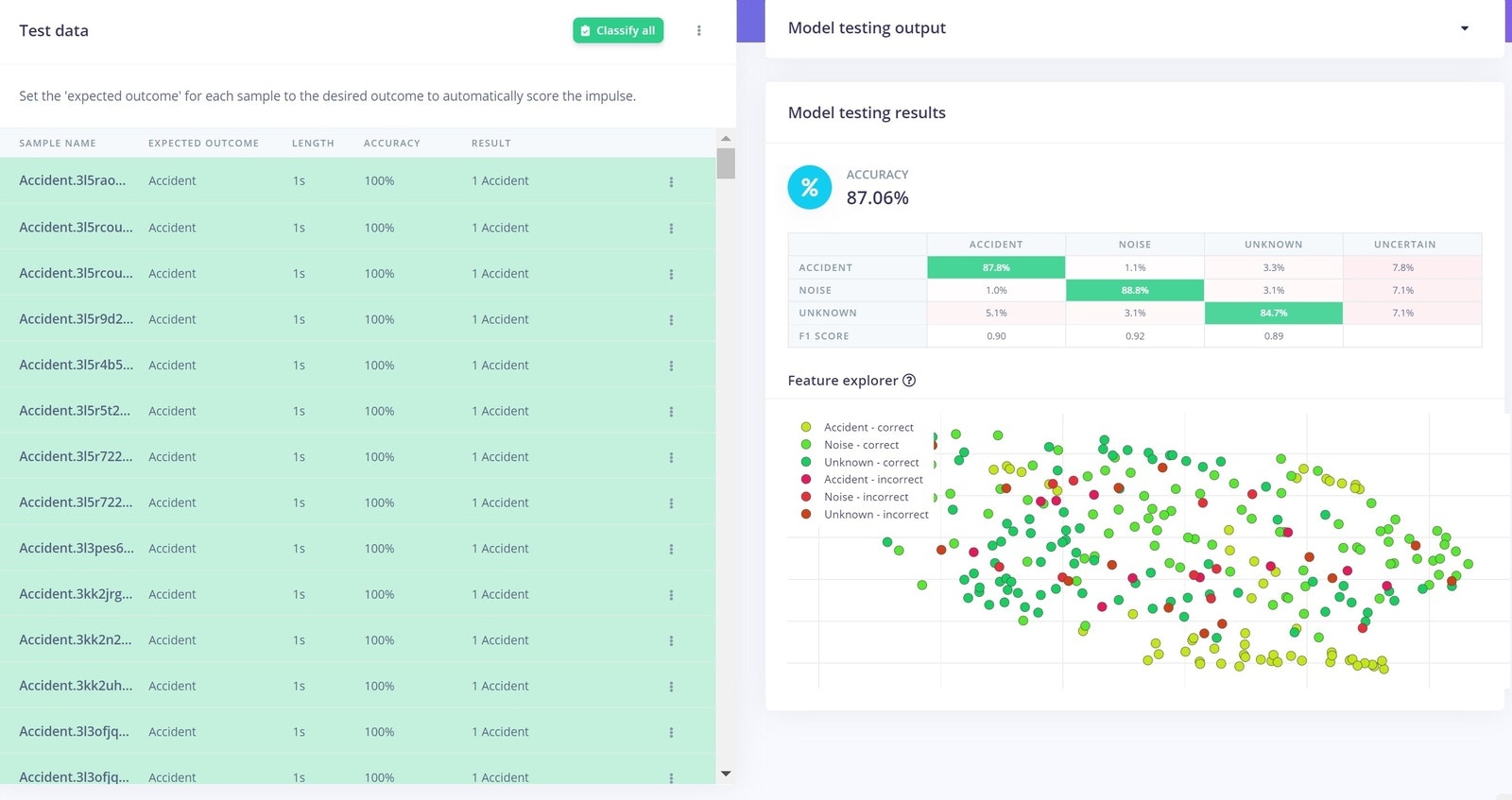 The next step in the process is to test the model on some new, unseen data before deploying it in the real world. When we collected data, we set aside that 4 minutes and 47 seconds of data for Testing, which was not used in the creation and training of the model. Now it can be used for Testing, by simply clicking on Model Testing on the left.