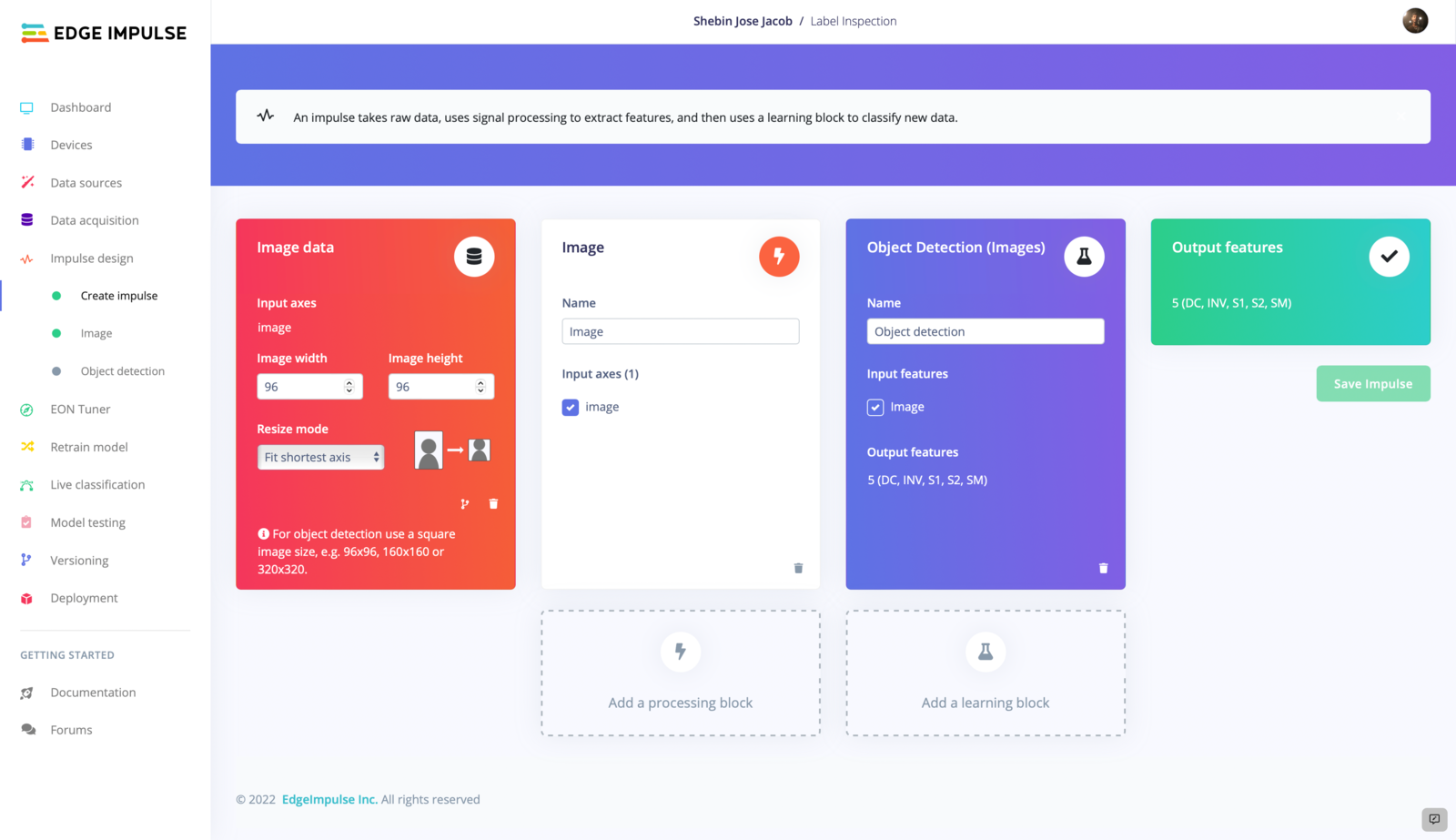 We are using FOMO as our object detection model, which performs better with 96 X 96 pixel images, so we set our image width and height to 96px. Keeping Resize Mode to Fit shortest axis, add an Image processing block and an Object Detection (Images) learning block to the impulse.