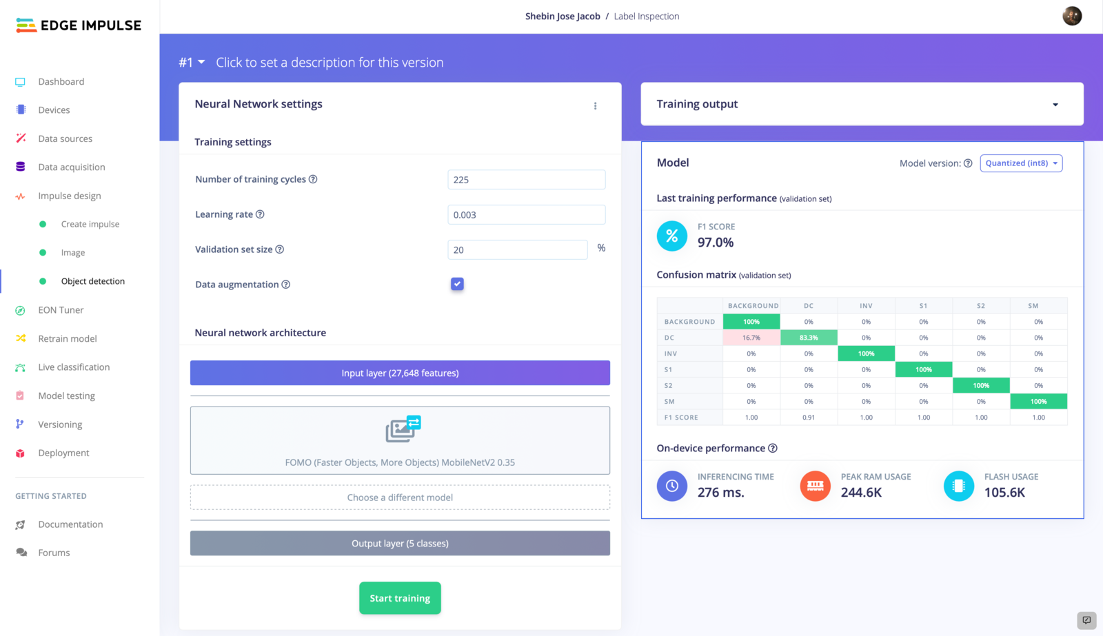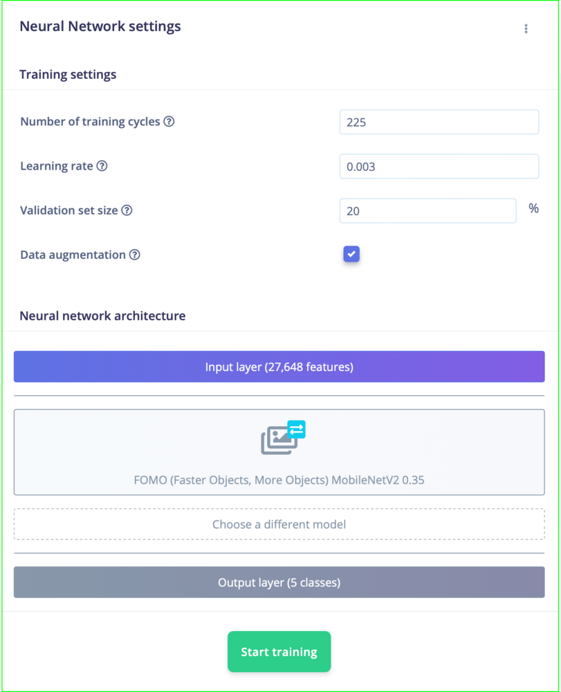 Once we have designed our impulse, let’s continue training the model. The model training settings we used are shown in the figure below. You can tweak the parameters in such a way that the trained model shows a greater accuracy but beware of overfitting when playing with model training settings.